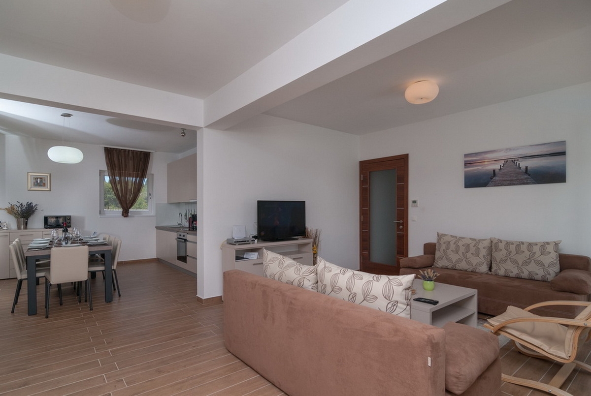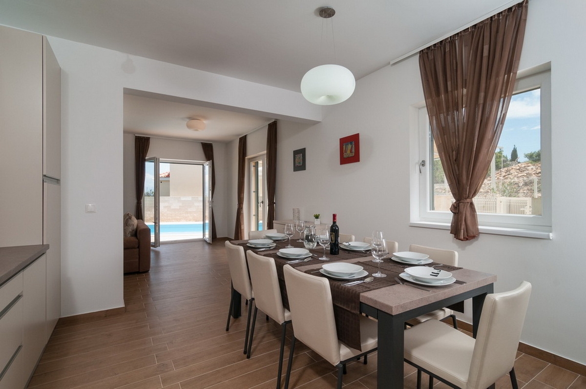 House can accommodate 8 guests. Beds are situated in 3 sleeping rooms, but also in the living room, within 115m2. Guests can use a private terrace to enjoy the warm summer evenings. The house offers the sea view. For full enjoyment and relaxation there is a private barbecue for this accommodation guests only. During stay, there is a private pool for relaxation and pleasure. INCLUDED IN THE PRICE: tourist tax, final cleaning, air-conditioning, central heating, pool, parking, internet, baby cot, additional bed, iron, ironing board, hairdryer. OBLIGATORY ADDITIONAL COSTS: short stay fee (surcharge depending on a number of booked nights: 30% - 1, 20% - 2, 10% - 3). The availability of additional services for your chosen dates of stay, as well as their prices (if none are listed) must be checked ahead of time. Any additional services not shown in the price calculation are payable directly to the property owner and only if used by the visitor. Discounts to the base price: free day 14=13 (for reservations of 14 or more days you get one free day for the stay until 31122026).