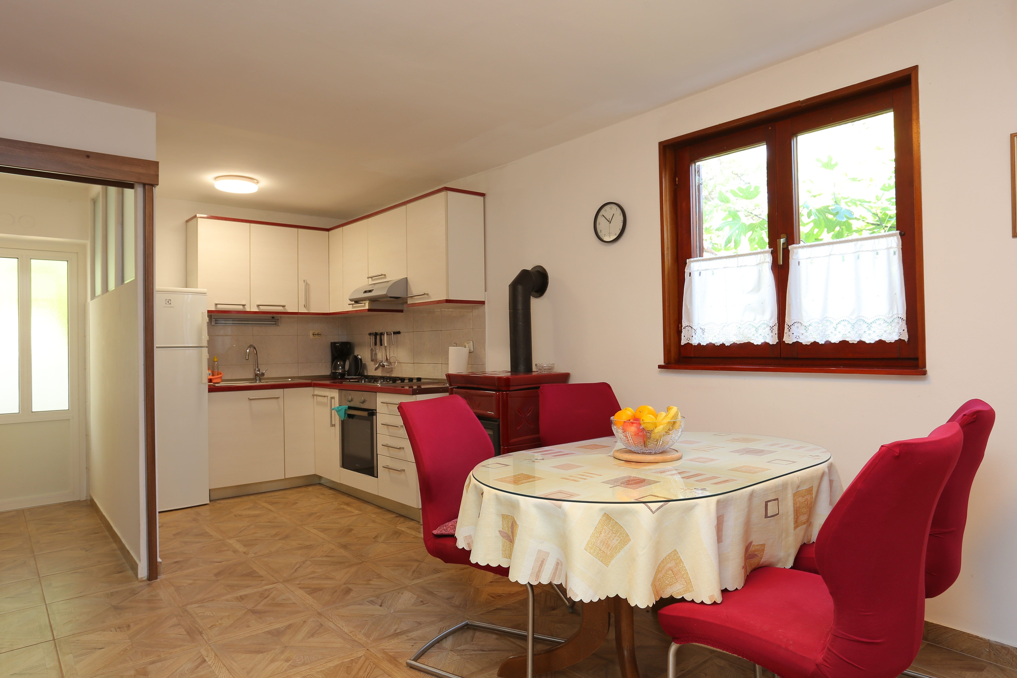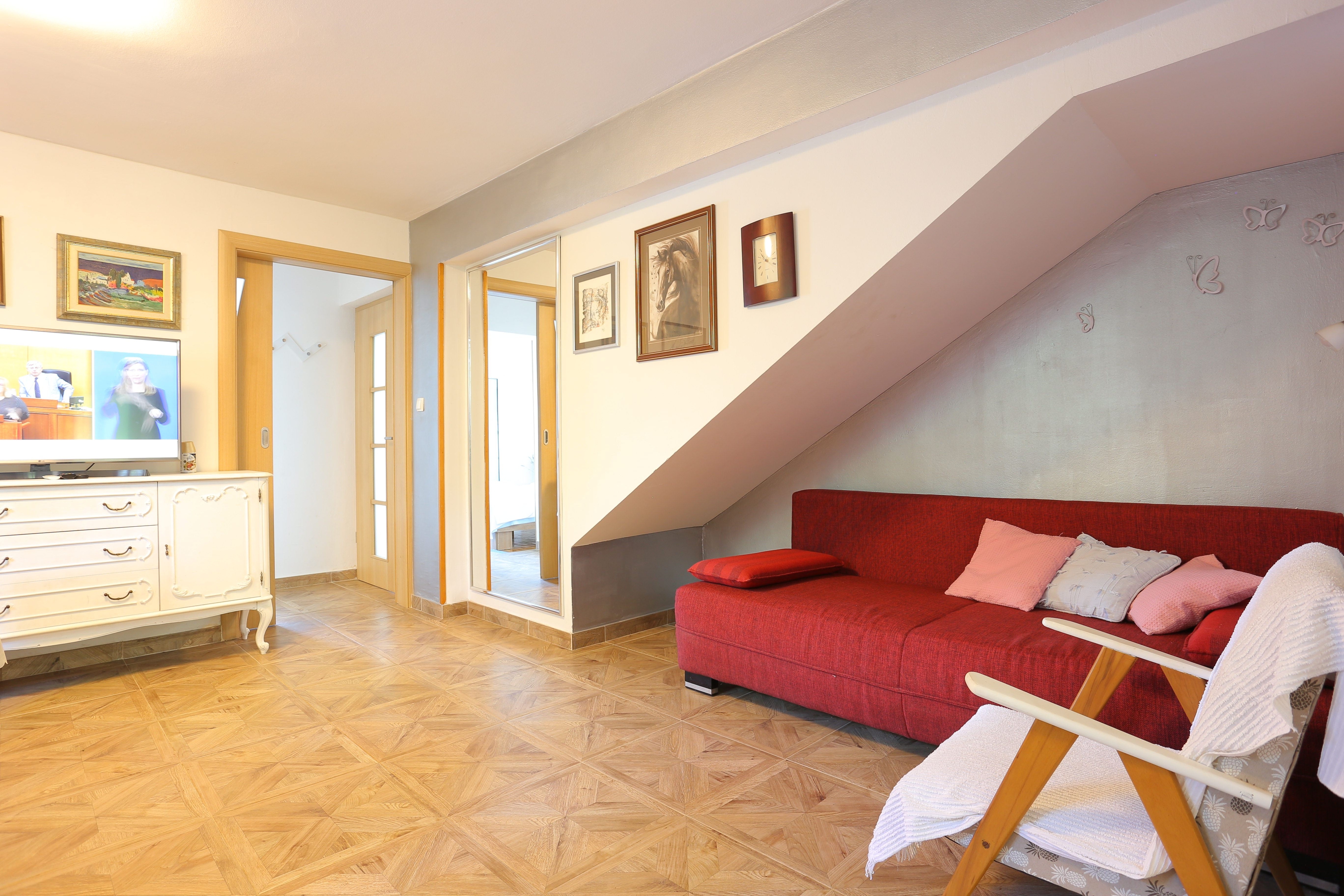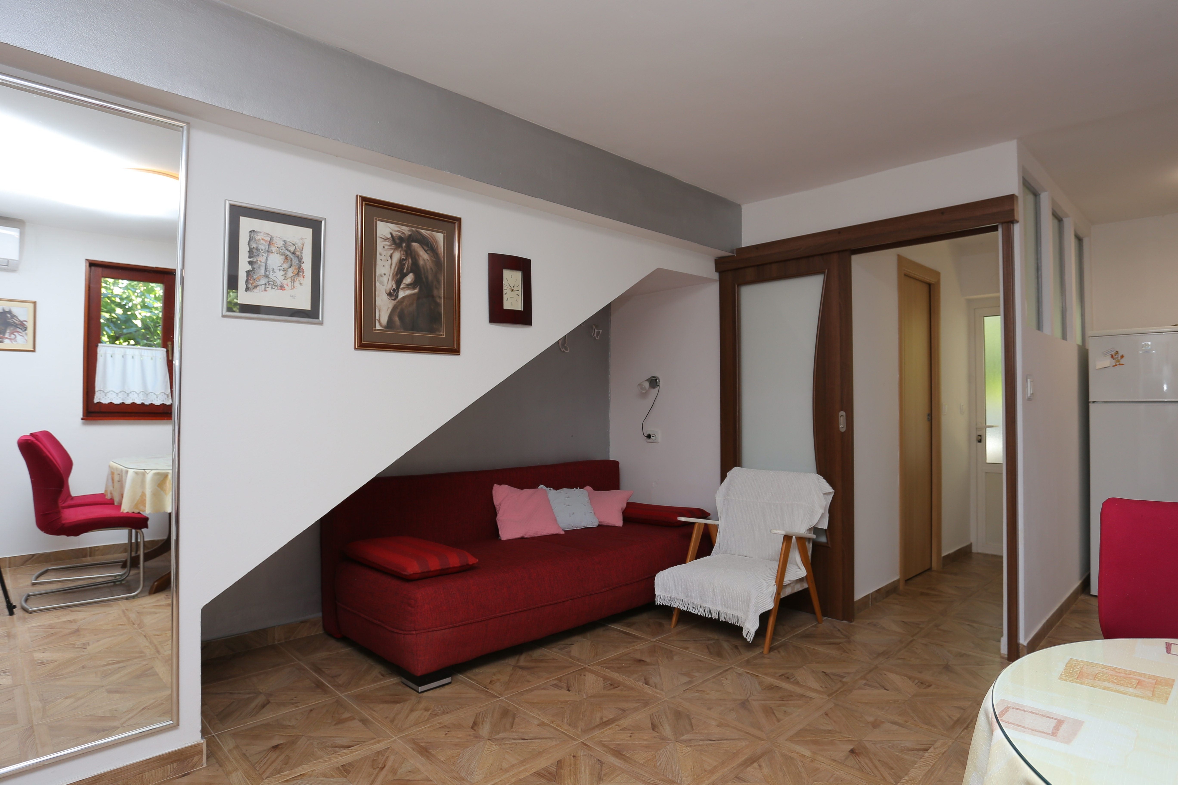 Apartment can accommodate 4 guests. Beds are situated in 1 sleeping rooms, but also in the dining room, within 40m2. Guests can use a private terrace to enjoy the warm summer evenings. The apartment offers the sea view. Food can be prepared using barbecue which is shared with other guests too. INCLUDED IN THE PRICE: tourist tax, final cleaning, air-conditioning, parking, internet, iron, hairdryer, sunshade. OBLIGATORY ADDITIONAL COSTS: short stay fee (surcharge depending on a number of booked nights: 30% - 1, 20% - 2, 10% - 3). The availability of additional services for your chosen dates of stay, as well as their prices (if none are listed) must be checked ahead of time. Any additional services not shown in the price calculation are payable directly to the property owner and only if used by the visitor. Discounts to the base price: free day 14=13 (for reservations of 14 or more days you get one free day for the stay until 31122026).