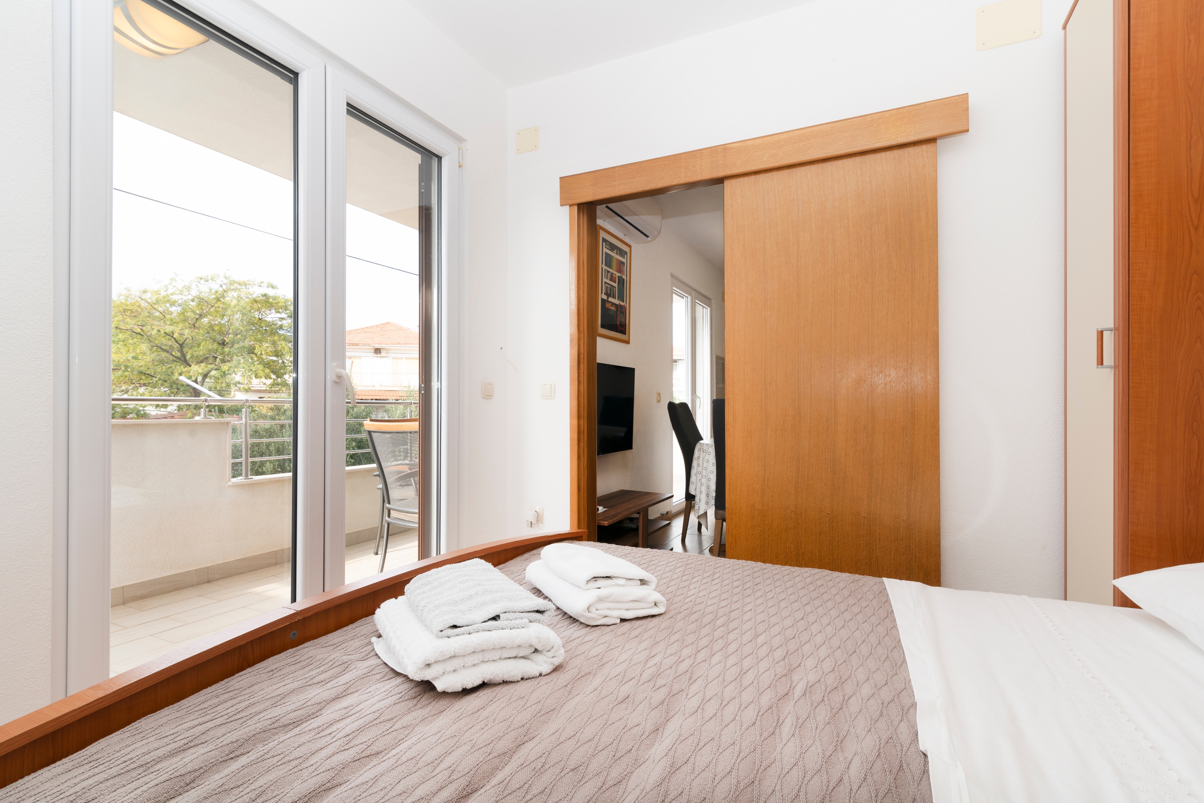 Apartment can accommodate 4 guests. Beds are situated in 1 sleeping rooms, but also in the living room, within 26m2. Guests can use a private terrace to enjoy the warm summer evenings. Food can be prepared using barbecue which is shared with other guests too. This accommodation unit welcomes pets at an additional charge. INCLUDED IN THE PRICE: tourist tax, final cleaning, air-conditioning, parking, internet, baby cot, iron, hairdryer. OBLIGATORY ADDITIONAL COSTS: short stay fee (surcharge depending on a number of booked nights: 30% - 1, 20% - 2, 10% - 3). OPTIONAL ADDITIONAL COSTS: pets (€10.00 per night). The availability of additional services for your chosen dates of stay, as well as their prices (if none are listed) must be checked ahead of time. Any additional services not shown in the price calculation are payable directly to the property owner and only if used by the visitor. Discounts to the base price: free day 14=13 (for reservations of 14 or more days you get one free day for the stay until 31122026).