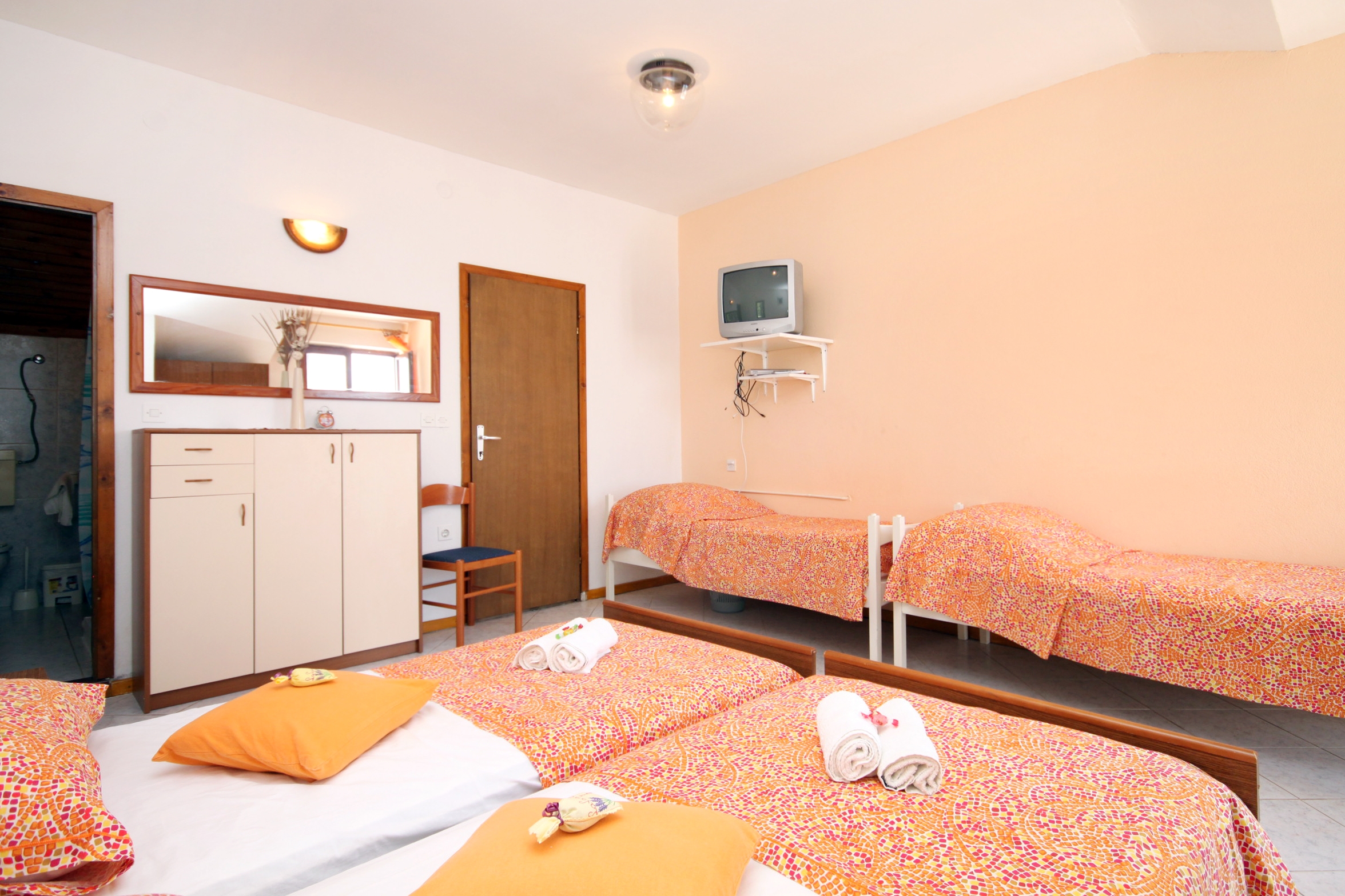 Studio flat can accommodate 4 guests. Beds are situated in 1 sleeping rooms, within 25m2. Guests can use a private terrace to enjoy the warm summer evenings. The studio offers the sea view. Food can be prepared using barbecue which is shared with other guests too. This accommodation unit welcomes pets at an additional charge. INCLUDED IN THE PRICE: tourist tax, final cleaning, air-conditioning, central heating, parking, internet, baby cot, iron, ironing board, hairdryer. OBLIGATORY ADDITIONAL COSTS: short stay fee (surcharge depending on a number of booked nights: 30% - 1, 20% - 2, 10% - 3). OPTIONAL ADDITIONAL COSTS: pets (€5.00 per night). The availability of additional services for your chosen dates of stay, as well as their prices (if none are listed) must be checked ahead of time. Any additional services not shown in the price calculation are payable directly to the property owner and only if used by the visitor. Discounts to the base price: free day 14=13 (for reservations of 14 or more days you get one free day for the stay until 31122026).