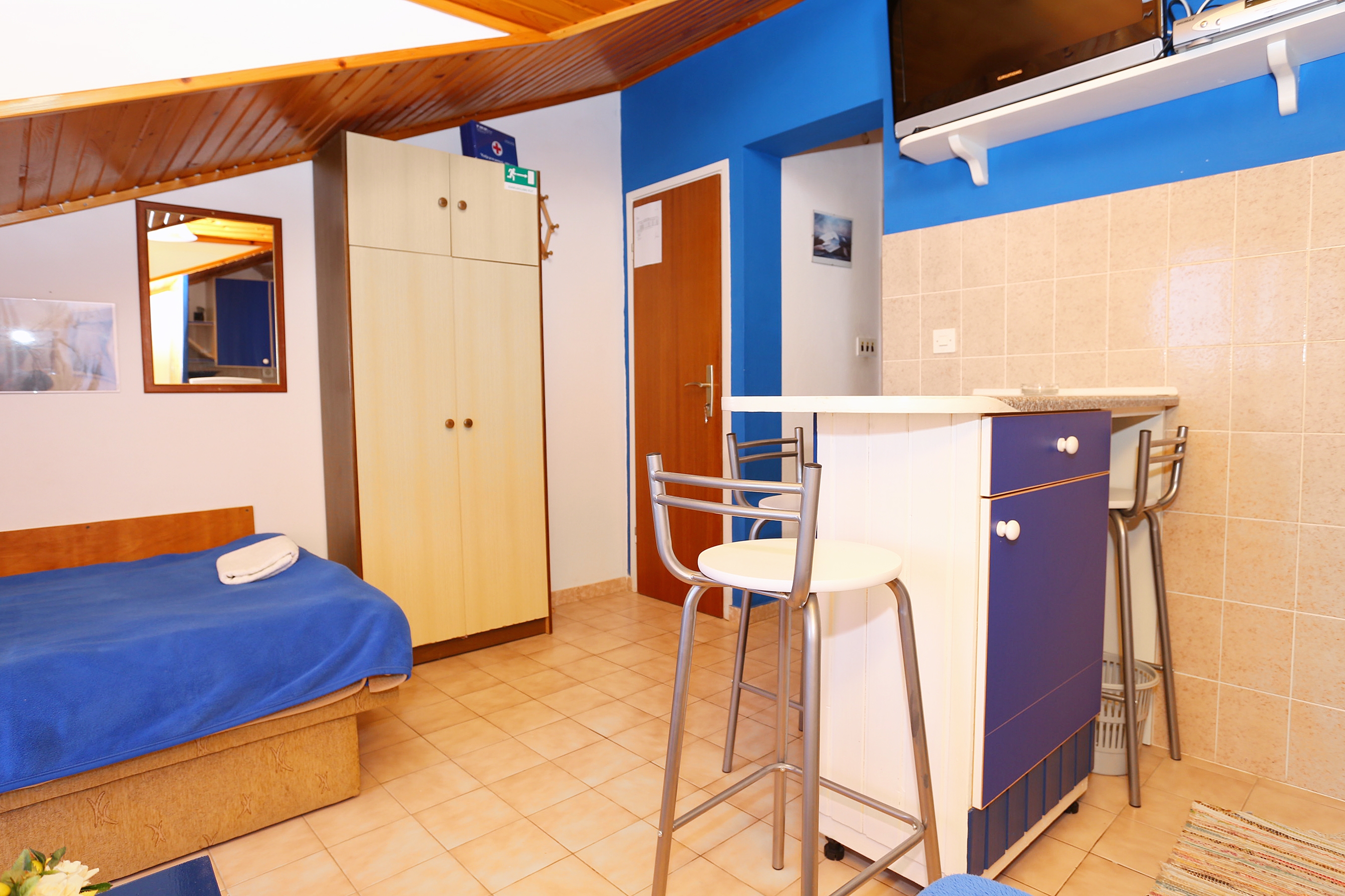 Apartment can accommodate 4 guests. Beds are situated in 1 sleeping rooms, but also in the living room, within 31m2. Guests can use a private terrace to enjoy the warm summer evenings. The apartment offers the sea view. Food can be prepared using barbecue which is shared with other guests too. This accommodation unit welcomes pets at an additional charge. INCLUDED IN THE PRICE: tourist tax, final cleaning, air-conditioning, parking, internet, laundry, boat mooring, baby cot, iron, ironing board, hairdryer, sunchairs. OBLIGATORY ADDITIONAL COSTS: short stay fee (surcharge depending on a number of booked nights: 30% - 1, 20% - 2, 10% - 3). OPTIONAL ADDITIONAL COSTS: pets (€9.00 per night), additional bed (€7.00 per night). The availability of additional services for your chosen dates of stay, as well as their prices (if none are listed) must be checked ahead of time. Any additional services not shown in the price calculation are payable directly to the property owner and only if used by the visitor. Discounts to the base price: free day 21=19 (for reservations of 21 or more days you get 2 free days for the stay until 31122026).