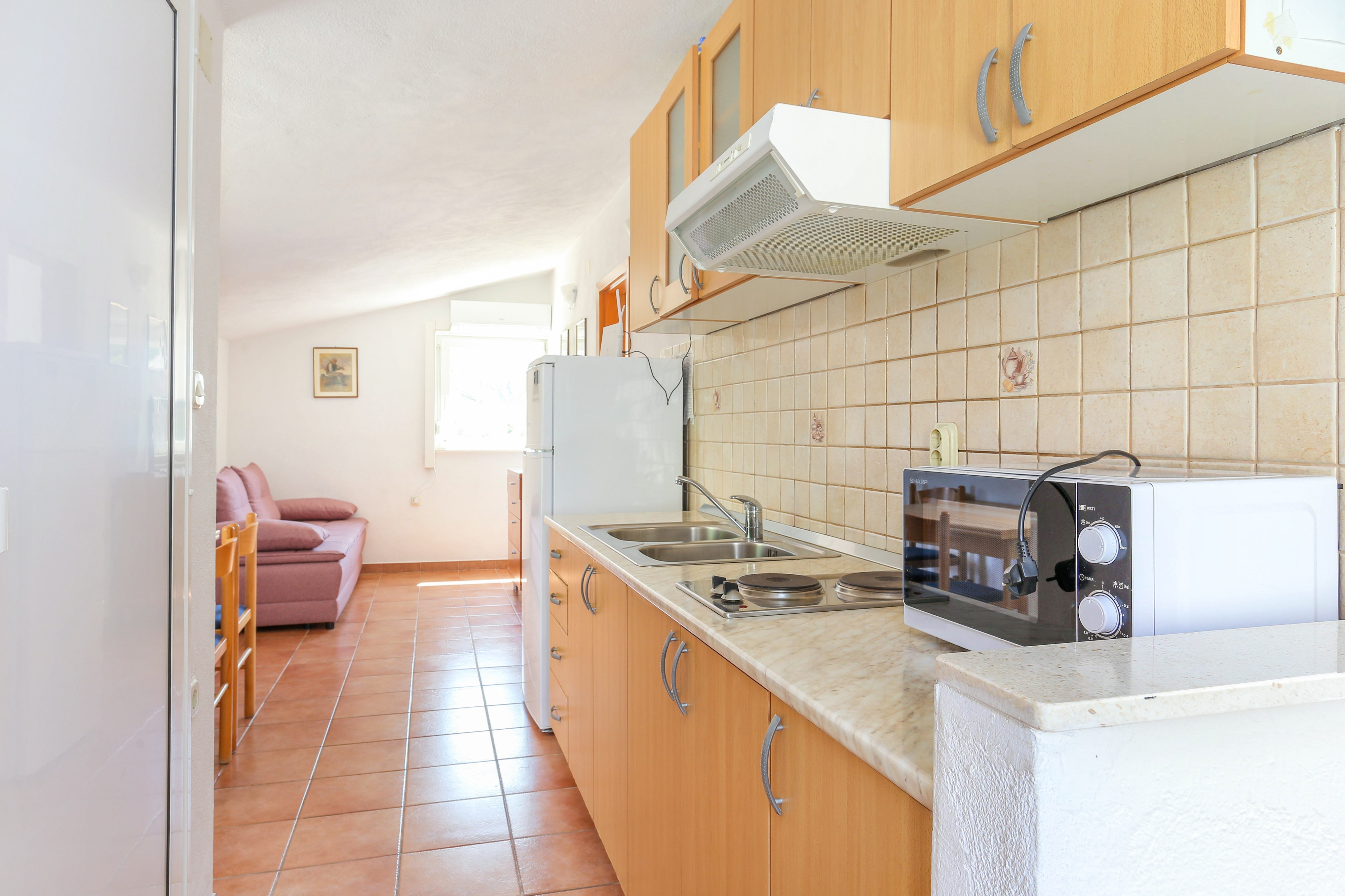 Apartment can accommodate 4 guests. Beds are situated in 1 sleeping rooms, but also in the living room, within 28m2. Guests can use a private balcony to enjoy the warm summer evenings. The apartment offers the sea view. Food can be prepared using barbecue which is shared with other guests too. INCLUDED IN THE PRICE: tourist tax, final cleaning, air-conditioning, parking, internet, laundry, baby cot, iron, ironing board, hairdryer. OBLIGATORY ADDITIONAL COSTS: short stay fee (surcharge depending on a number of booked nights: 30% - 1, 20% - 2, 10% - 3). The availability of additional services for your chosen dates of stay, as well as their prices (if none are listed) must be checked ahead of time. Any additional services not shown in the price calculation are payable directly to the property owner and only if used by the visitor.