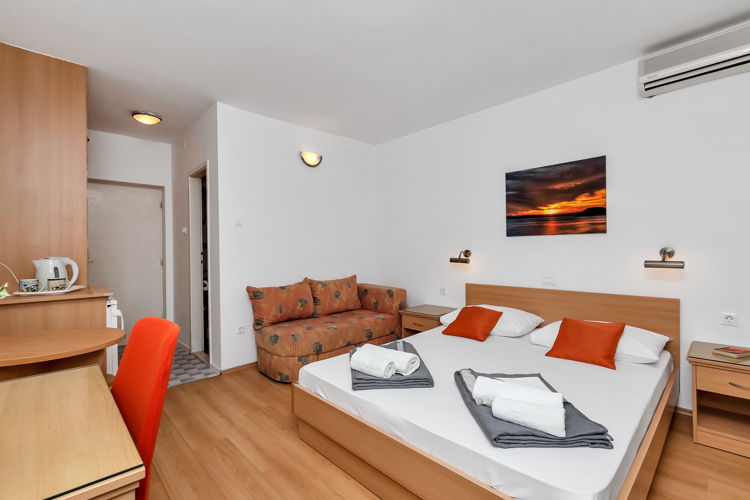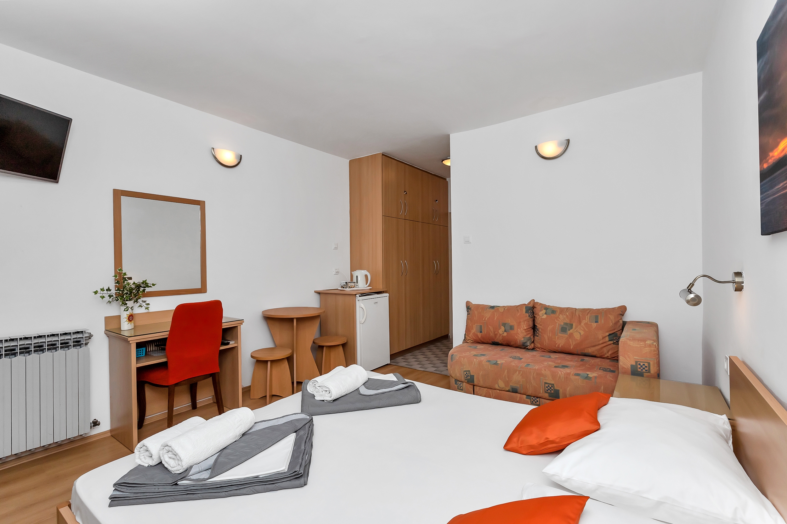 Room can accommodate 2 guests. Beds are situated in 1 sleeping rooms, within 19m2. Use of shared kitchen is possible. Guests can use a private terrace to enjoy the warm summer evenings. Food can be prepared using barbecue which is shared with other guests too. Reserved accommodation unit is a room with its own bathroom and shared kitchen at no additional charge. INCLUDED IN THE PRICE: tourist tax, final cleaning, air-conditioning, shared kitchen, parking, internet, laundry, baby cot, iron, ironing board, hairdryer. OPTIONAL ADDITIONAL COSTS: additional bed (€15.00 per night). The availability of additional services for your chosen dates of stay, as well as their prices (if none are listed) must be checked ahead of time. Any additional services not shown in the price calculation are payable directly to the property owner and only if used by the visitor.