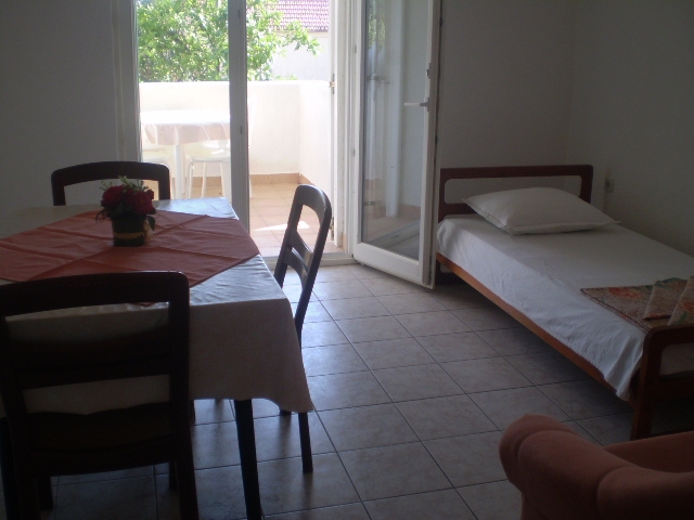 Apartment can accommodate 4 guests. Beds are situated in 1 sleeping rooms, but also in the dining room, within 30m2. Guests can use a private terrace to enjoy the warm summer evenings. Food can be prepared using barbecue which is shared with other guests too. INCLUDED IN THE PRICE: tourist tax, final cleaning, parking, internet, iron, ironing board. OBLIGATORY ADDITIONAL COSTS: short stay fee (surcharge depending on a number of booked nights: 30% - 1, 20% - 2, 10% - 3). OPTIONAL ADDITIONAL COSTS: air-conditioning (€5.00 per night), laundry (€5.00 washing). The availability of additional services for your chosen dates of stay, as well as their prices (if none are listed) must be checked ahead of time. Any additional services not shown in the price calculation are payable directly to the property owner and only if used by the visitor.