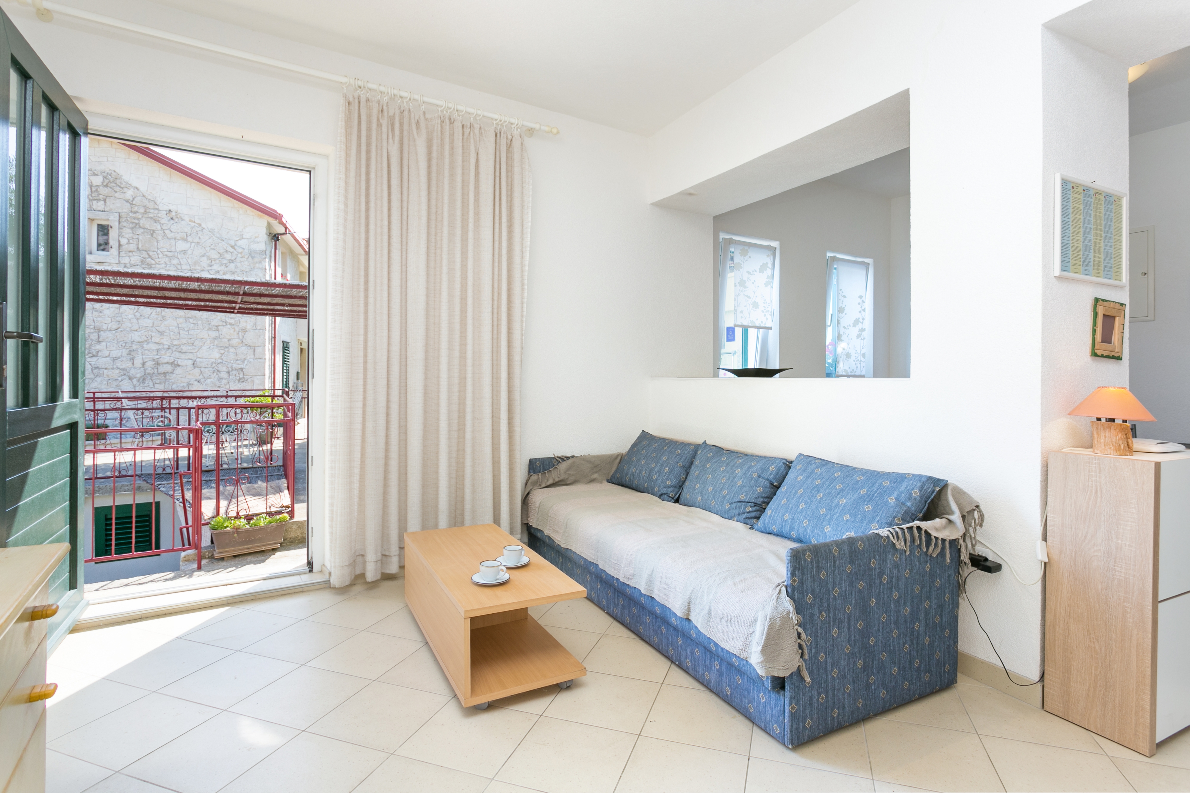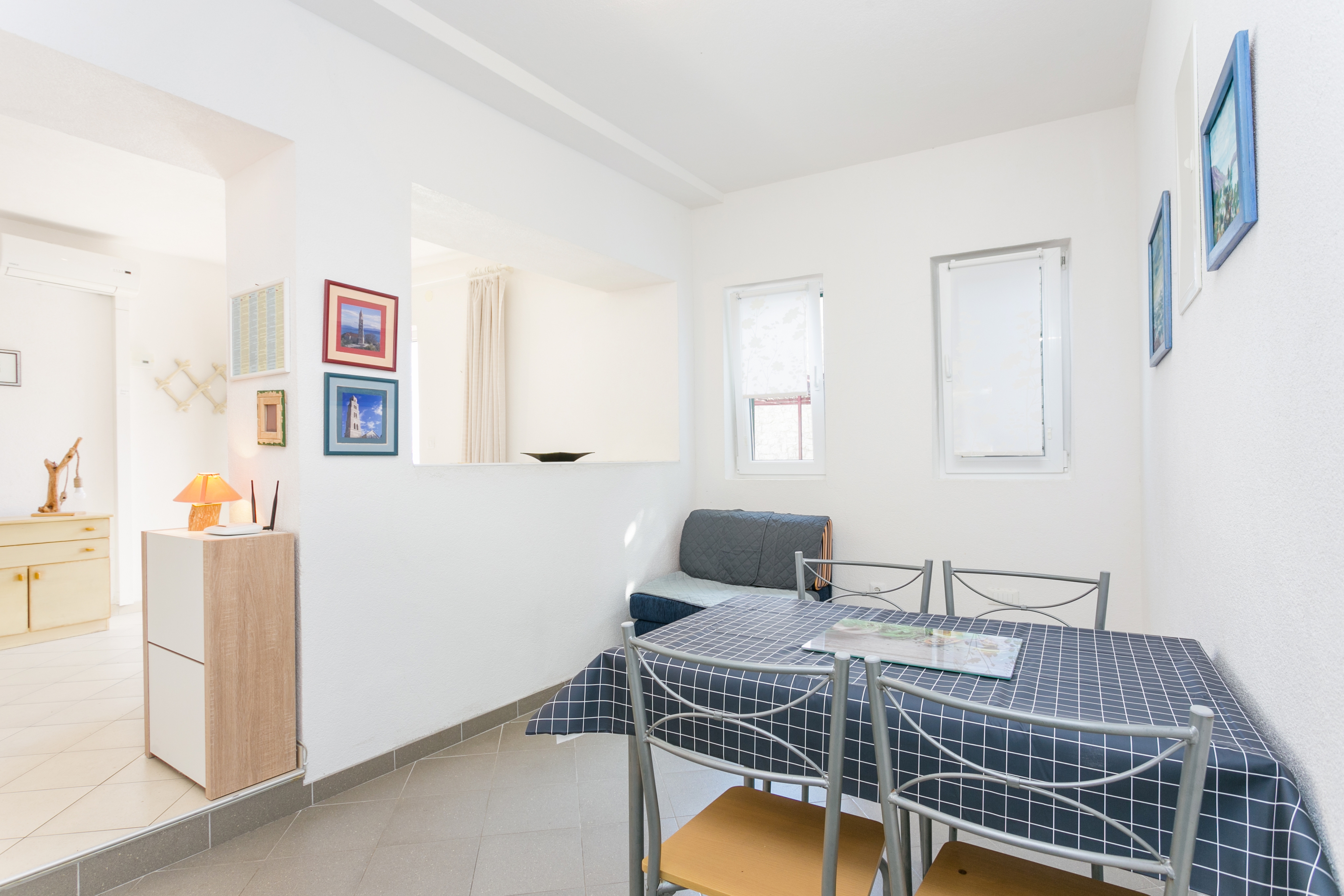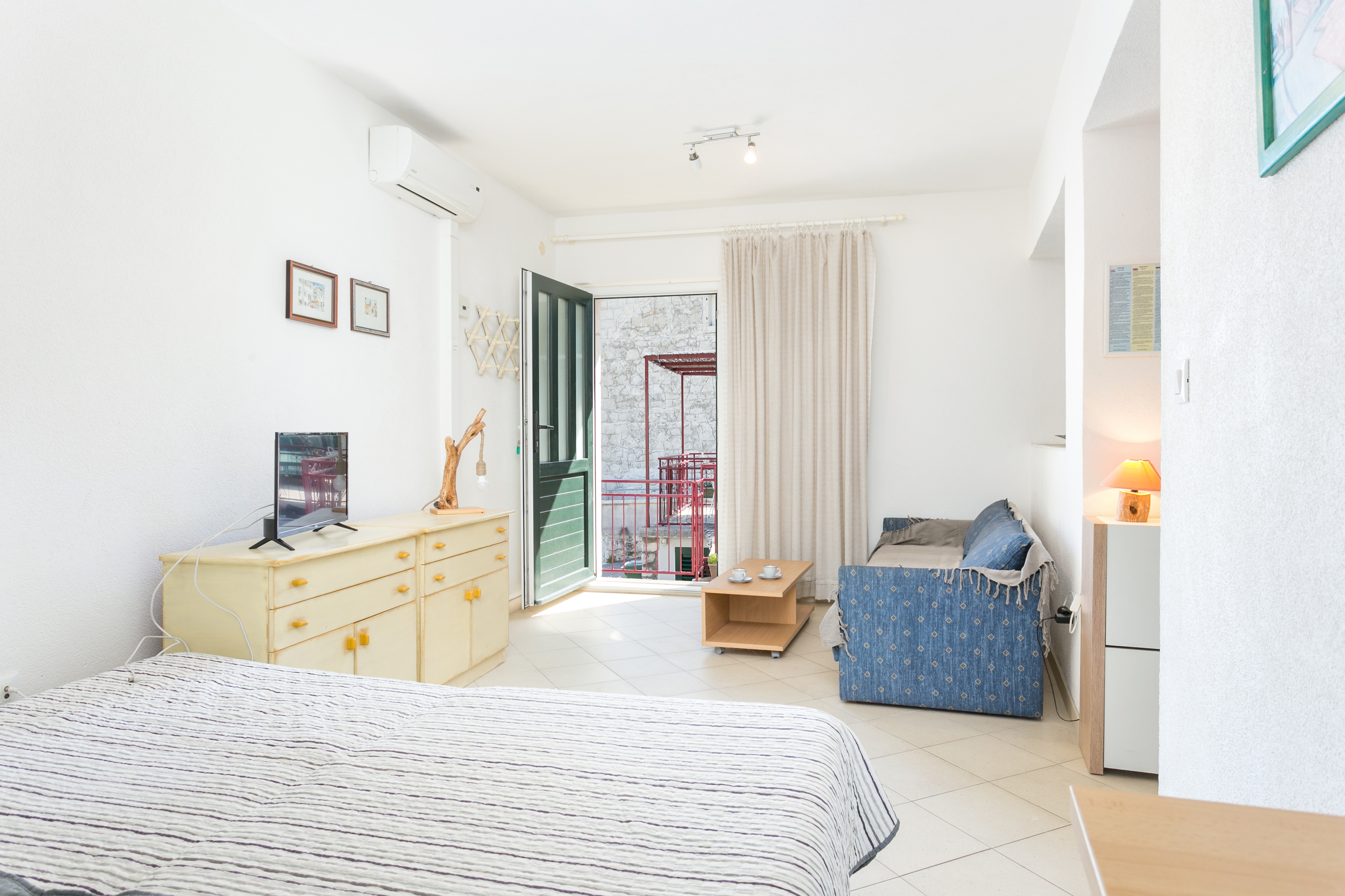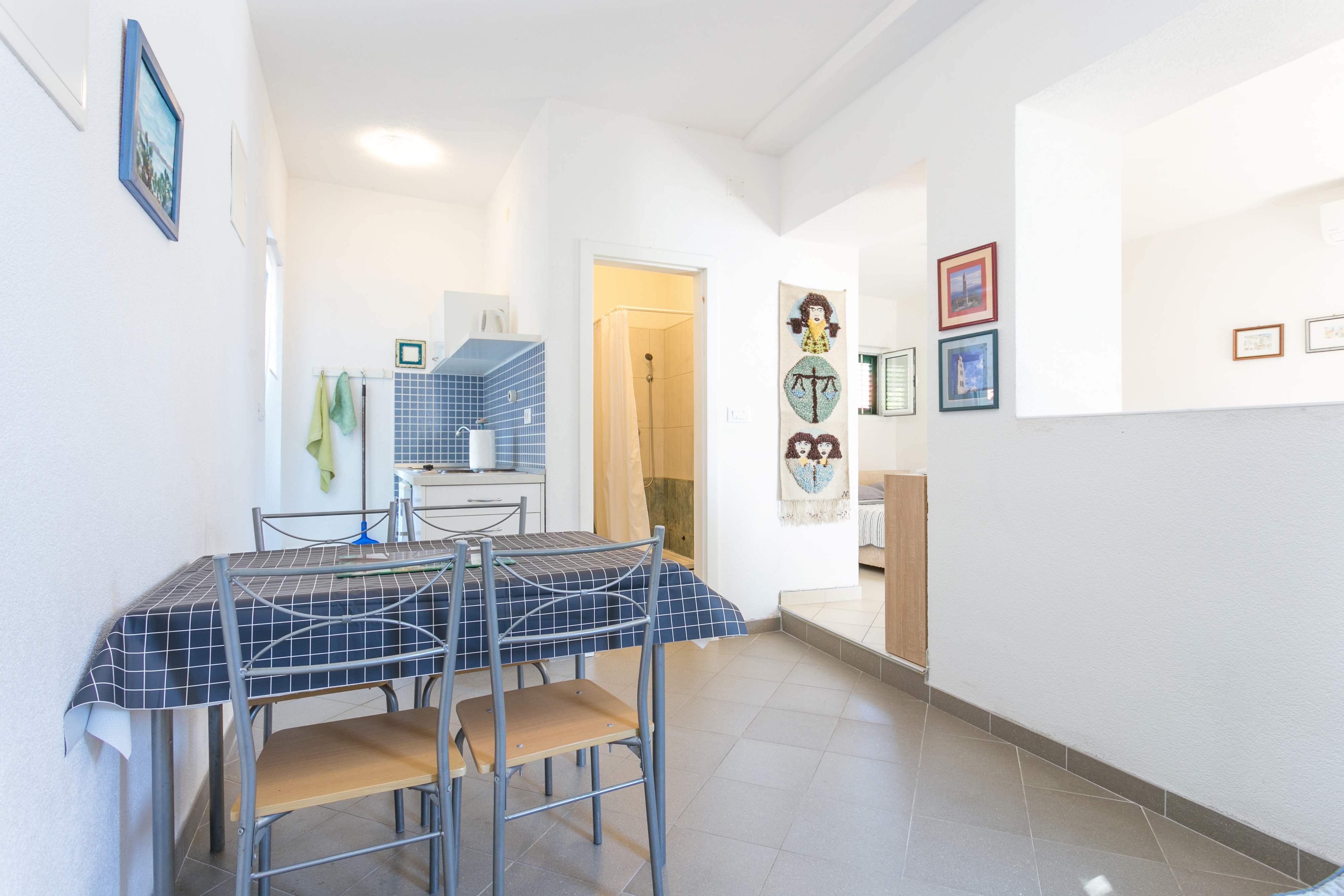 Studio flat can accommodate 4 guests. Beds are situated in 1 sleeping rooms, but also in the living room and dining room, within 26m2. Guests can use a private terrace to enjoy the warm summer evenings. The studio offers the sea view. Food can be prepared using barbecue which is shared with other guests too. This accommodation unit welcomes pets at an additional charge. Some of the rooms of the accommodation unit are not connected with the rest of the unit. INCLUDED IN THE PRICE: tourist tax, final cleaning, air-conditioning, parking, internet, baby cot, portable barbecue. OPTIONAL ADDITIONAL COSTS: pets (€5.00 per night). The availability of additional services for your chosen dates of stay, as well as their prices (if none are listed) must be checked ahead of time. Any additional services not shown in the price calculation are payable directly to the property owner and only if used by the visitor. Discounts to the base price: free day 14=13 (for reservations of 14 or more days you get one free day for the stay until 31122026).