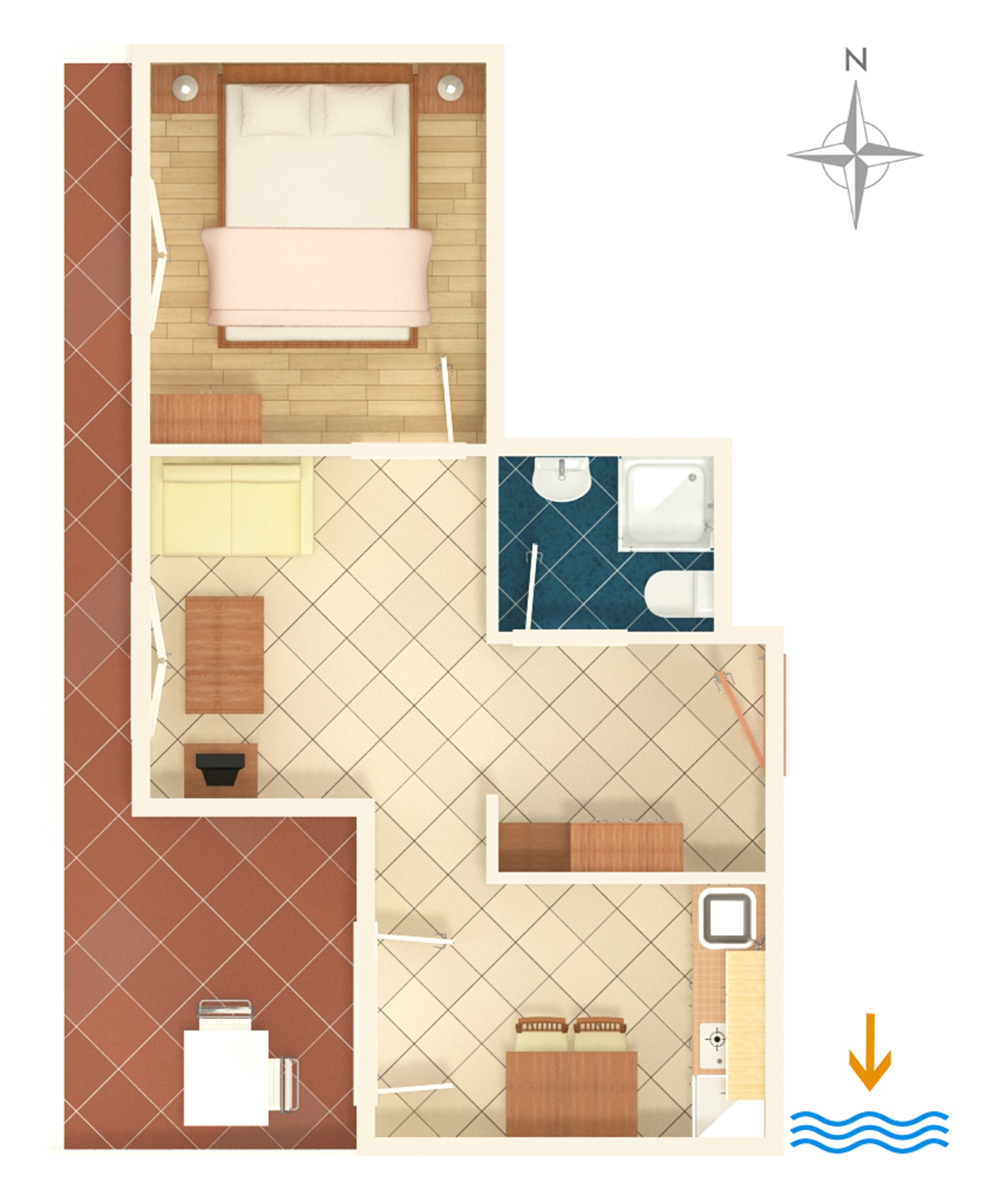 Apartment can accommodate 4 guests. Beds are situated in 1 sleeping rooms, but also in the living room, within 24m2. Guests can use a private terrace to enjoy the warm summer evenings. The apartment offers the sea view. Food can be prepared using barbecue which is shared with other guests too. INCLUDED IN THE PRICE: tourist tax, final cleaning, air-conditioning, parking, internet, portable barbecue. OBLIGATORY ADDITIONAL COSTS: short stay fee (surcharge depending on a number of booked nights: 30% - 1, 20% - 2, 10% - 3). The availability of additional services for your chosen dates of stay, as well as their prices (if none are listed) must be checked ahead of time. Any additional services not shown in the price calculation are payable directly to the property owner and only if used by the visitor.