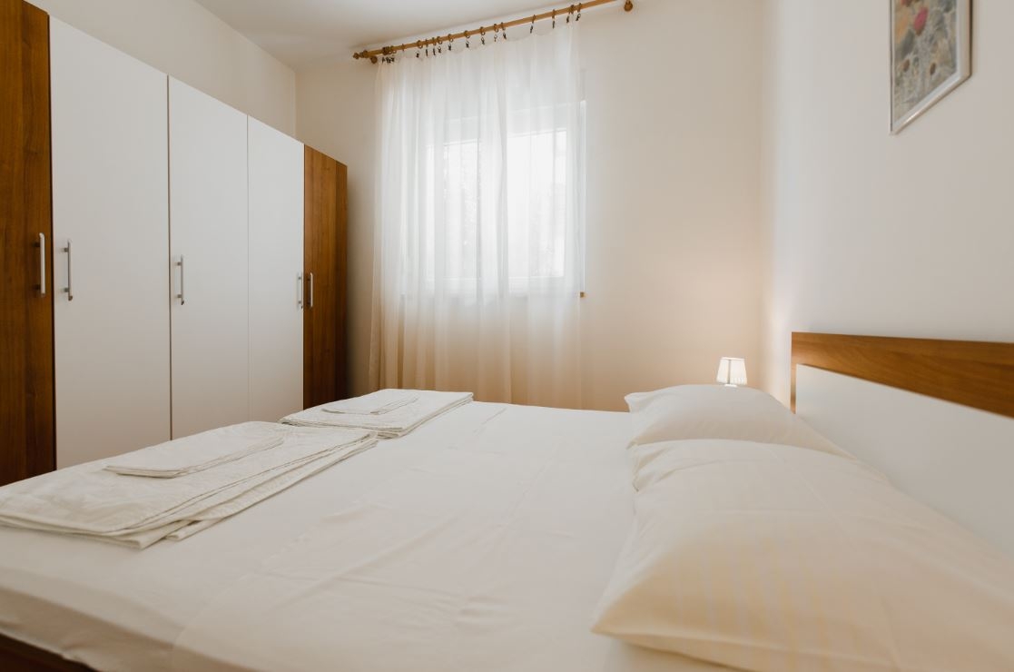 Apartment can accommodate 6 guests. Beds are situated in 2 sleeping rooms, but also in the living room, within 69m2. Guests can use a private terrace to enjoy the warm summer evenings. Food can be prepared using barbecue which is shared with other guests too. INCLUDED IN THE PRICE: tourist tax, final cleaning, air-conditioning, parking, internet, baby cot, iron, ironing board, hairdryer. OBLIGATORY ADDITIONAL COSTS: short stay fee (surcharge depending on a number of booked nights: 30% - 1, 20% - 2, 10% - 3). OPTIONAL ADDITIONAL COSTS: boat (€50.00 per night), boat mooring (€20.00 per night), bicycle (€20.00 daily (per piece)). The availability of additional services for your chosen dates of stay, as well as their prices (if none are listed) must be checked ahead of time. Any additional services not shown in the price calculation are payable directly to the property owner and only if used by the visitor. Discounts to the base price: free day 14=13 (for reservations of 14 or more days you get one free day for the stay until 31122026).