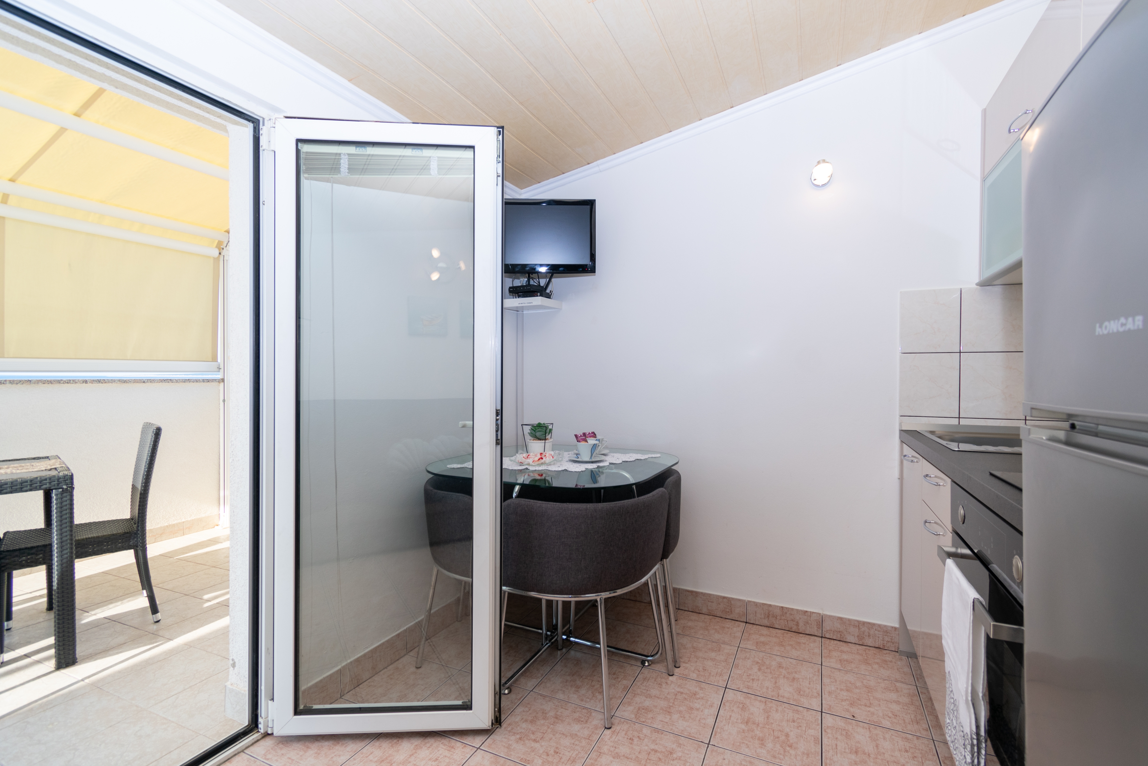 Apartment can accommodate 4 guests. Beds are situated in 1 sleeping rooms, but also in the dining room, within 29m2. Guests can use a private terrace to enjoy the warm summer evenings. The apartment offers the sea view. Food can be prepared using barbecue which is shared with other guests too. This accommodation unit welcomes pets at an additional charge. INCLUDED IN THE PRICE: tourist tax, final cleaning, air-conditioning, parking, internet, laundry, hairdryer, portable barbecue. OBLIGATORY ADDITIONAL COSTS: short stay fee (surcharge depending on a number of booked nights: 30% - 1, 20% - 2, 10% - 3). OPTIONAL ADDITIONAL COSTS: pets (€5.00 per night). The availability of additional services for your chosen dates of stay, as well as their prices (if none are listed) must be checked ahead of time. Any additional services not shown in the price calculation are payable directly to the property owner and only if used by the visitor.