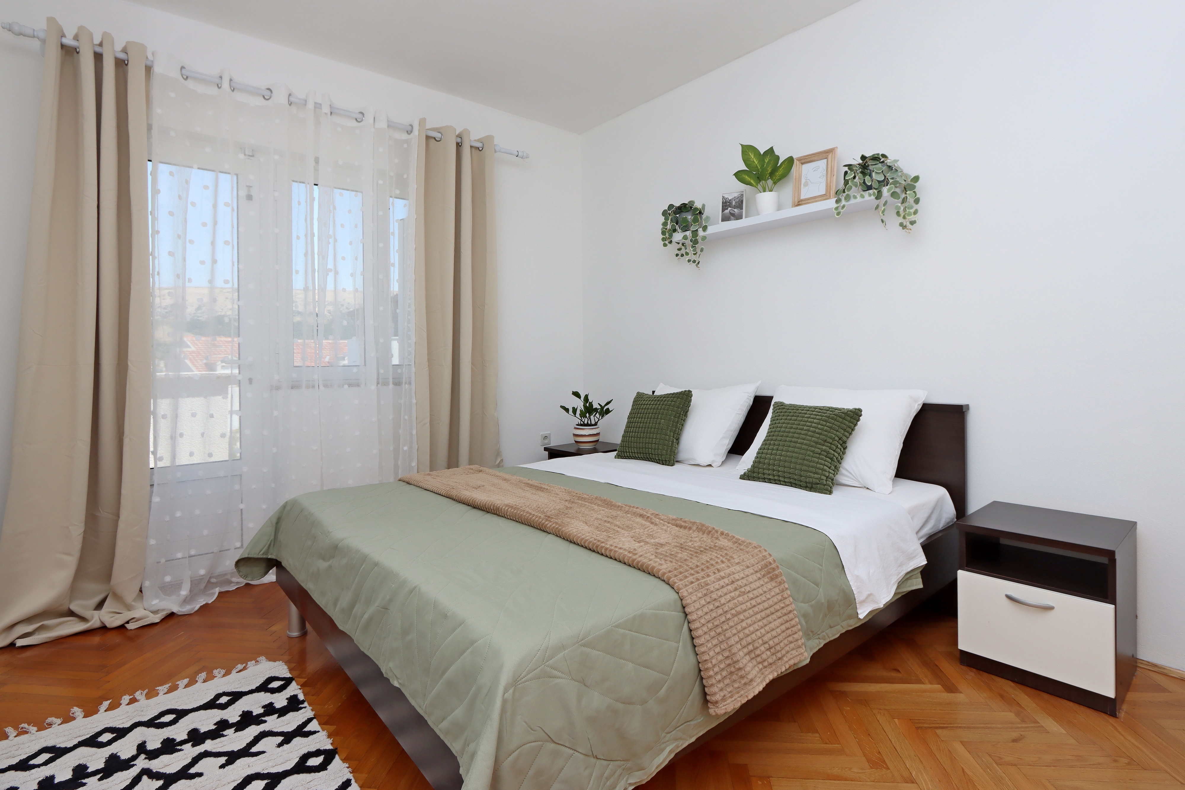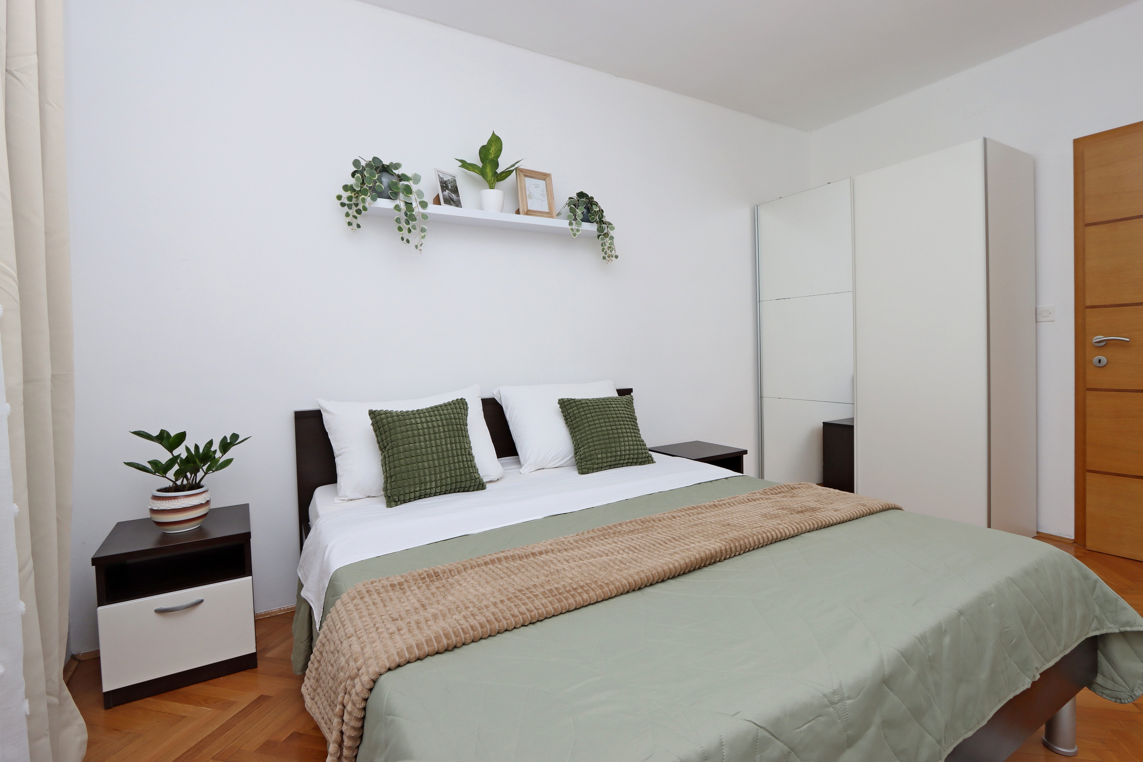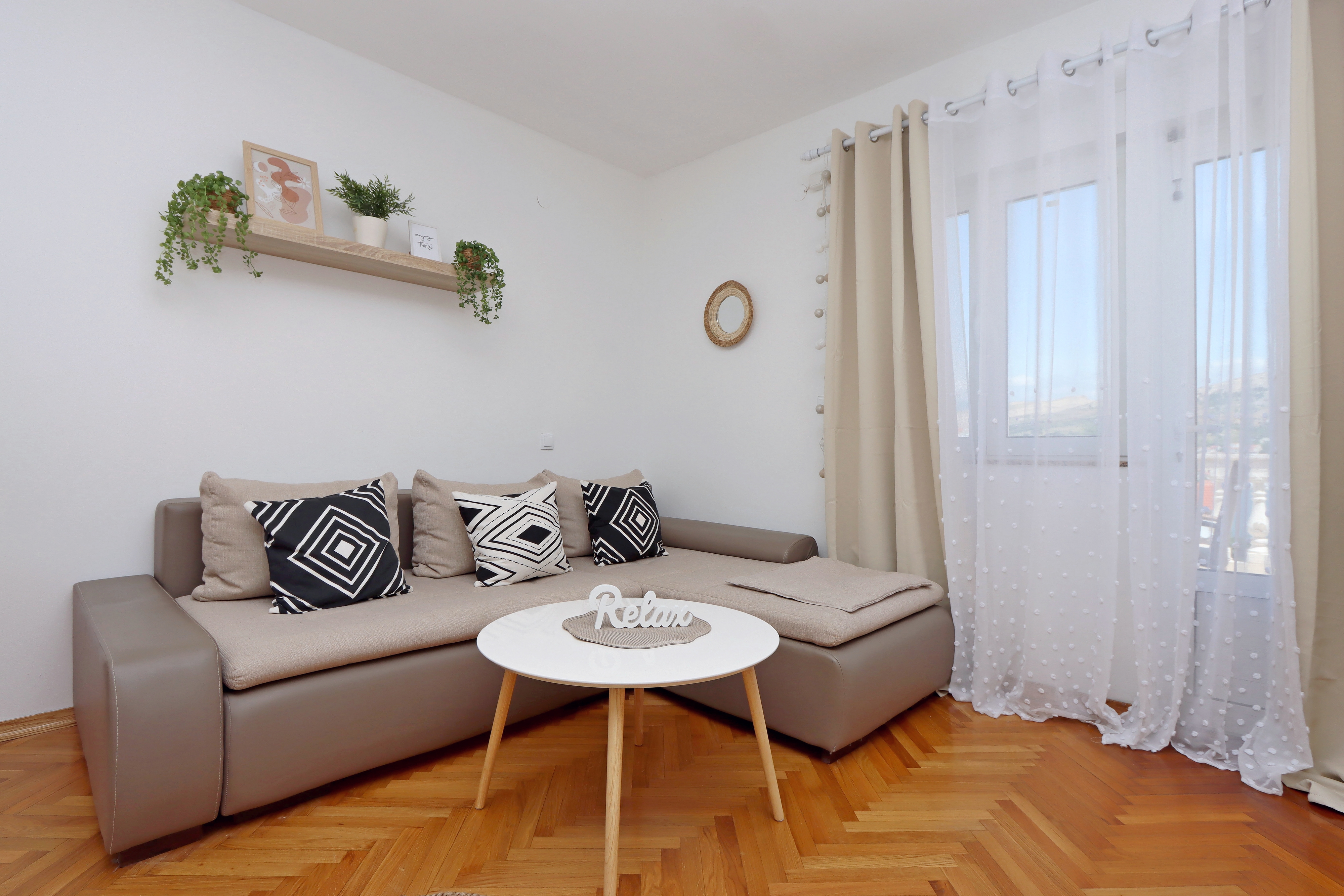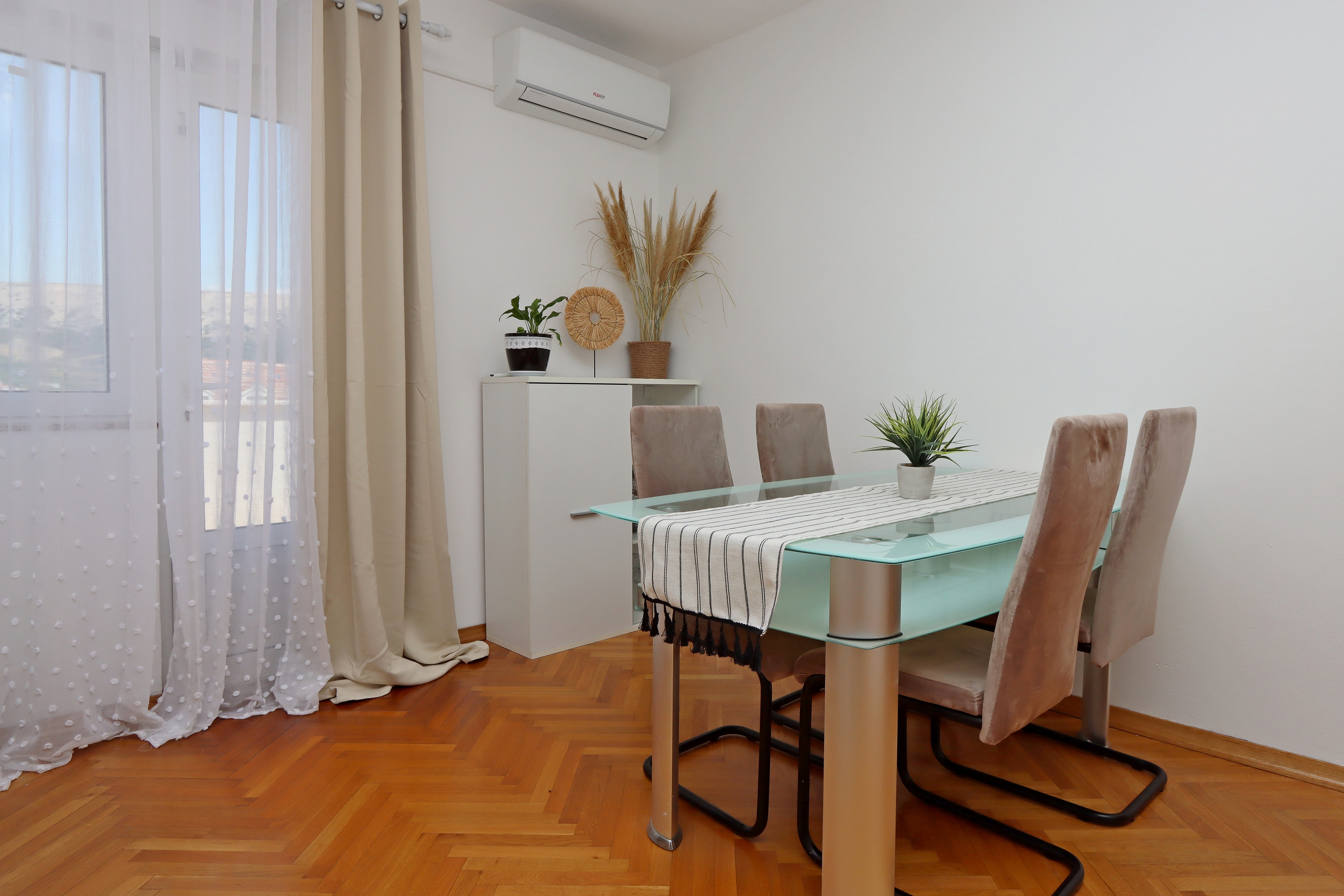 Apartment can accommodate 5 guests. Beds are situated in 2 sleeping rooms, but also in the living room, within 63m2. Guests can use a private terrace to enjoy the warm summer evenings. The apartment offers the sea view. Food can be prepared using barbecue which is shared with other guests too. Shared pool is on disposal during stay. INCLUDED IN THE PRICE: tourist tax, final cleaning, air-conditioning, pool, parking, internet, laundry, iron, hairdryer. OBLIGATORY ADDITIONAL COSTS: short stay fee (surcharge depending on a number of booked nights: 30% - 1, 20% - 2, 10% - 3). The availability of additional services for your chosen dates of stay, as well as their prices (if none are listed) must be checked ahead of time. Any additional services not shown in the price calculation are payable directly to the property owner and only if used by the visitor. Discounts to the base price: free day 21=19 (for reservations of 21 or more days you get 2 free days for the stay until 31122026).