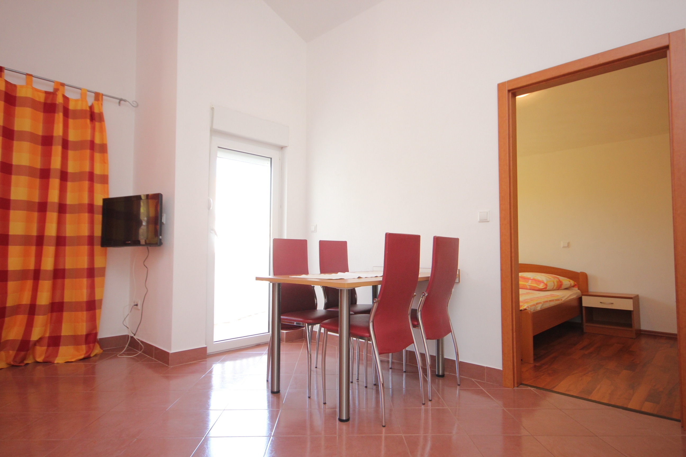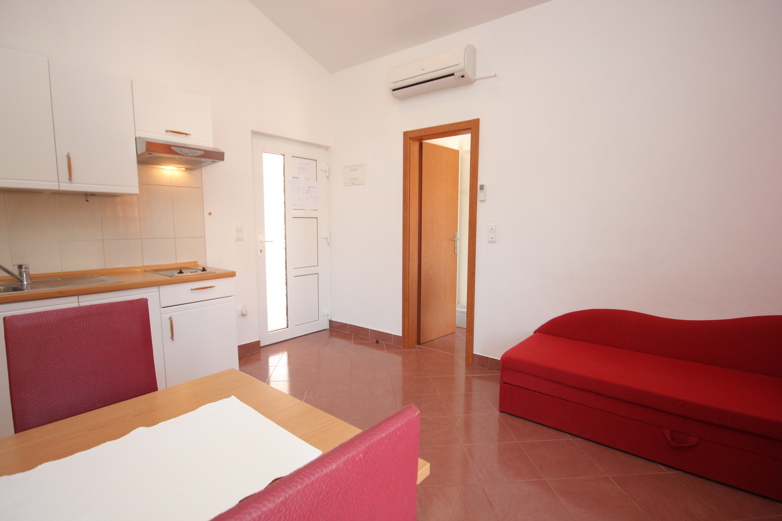 Apartment can accommodate 4 guests. Beds are situated in 1 sleeping rooms, but also in the living room, within 29m2. Guests can use a private terrace to enjoy the warm summer evenings. Food can be prepared using barbecue which is shared with other guests too. This accommodation unit welcomes pets at an additional charge. INCLUDED IN THE PRICE: tourist tax, final cleaning, air-conditioning, parking, internet, baby cot. OBLIGATORY ADDITIONAL COSTS: short stay fee (surcharge depending on a number of booked nights: 30% - 1, 20% - 2, 10% - 3). OPTIONAL ADDITIONAL COSTS: pets (€5.00 per night). The availability of additional services for your chosen dates of stay, as well as their prices (if none are listed) must be checked ahead of time. Any additional services not shown in the price calculation are payable directly to the property owner and only if used by the visitor.