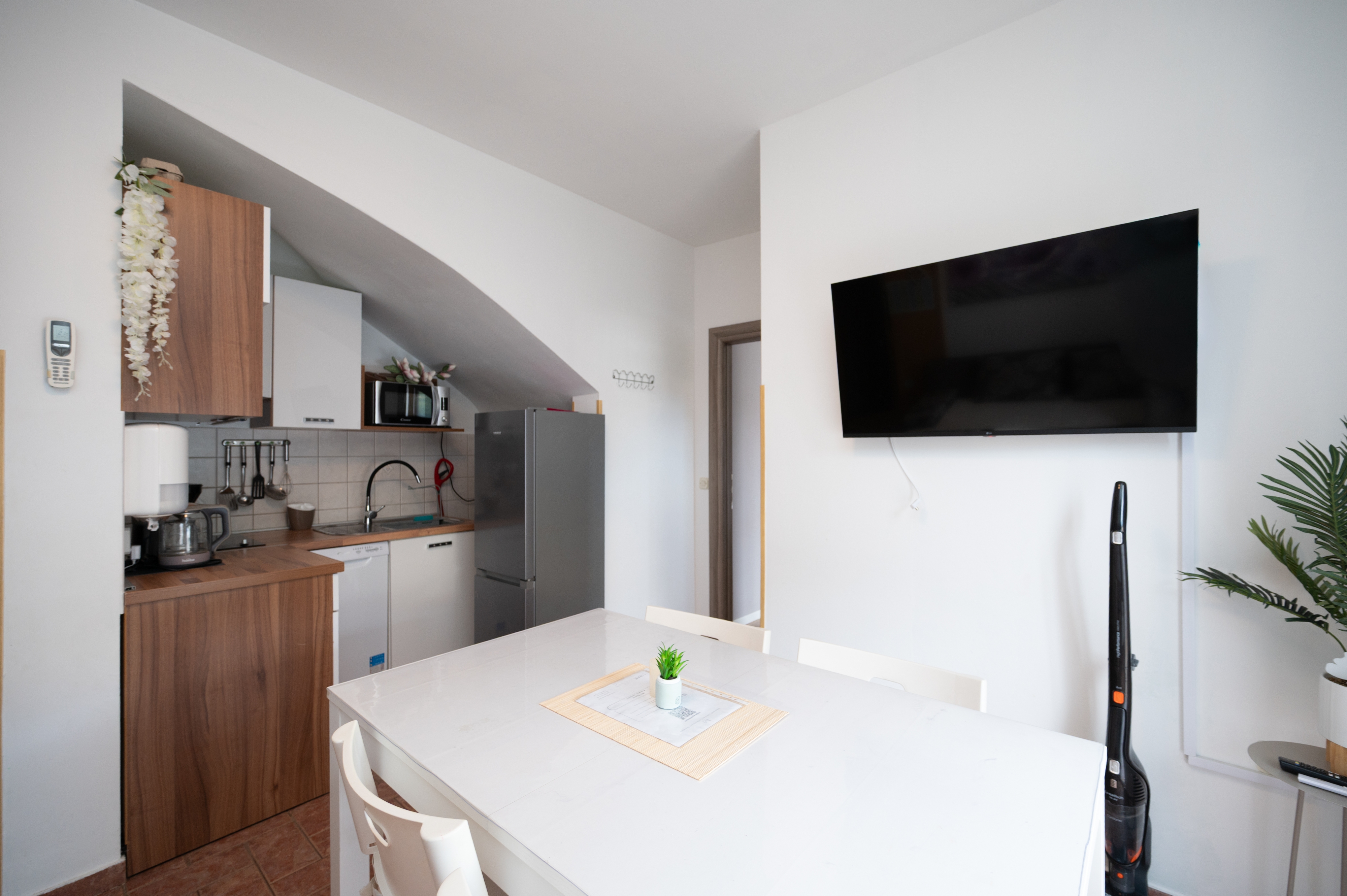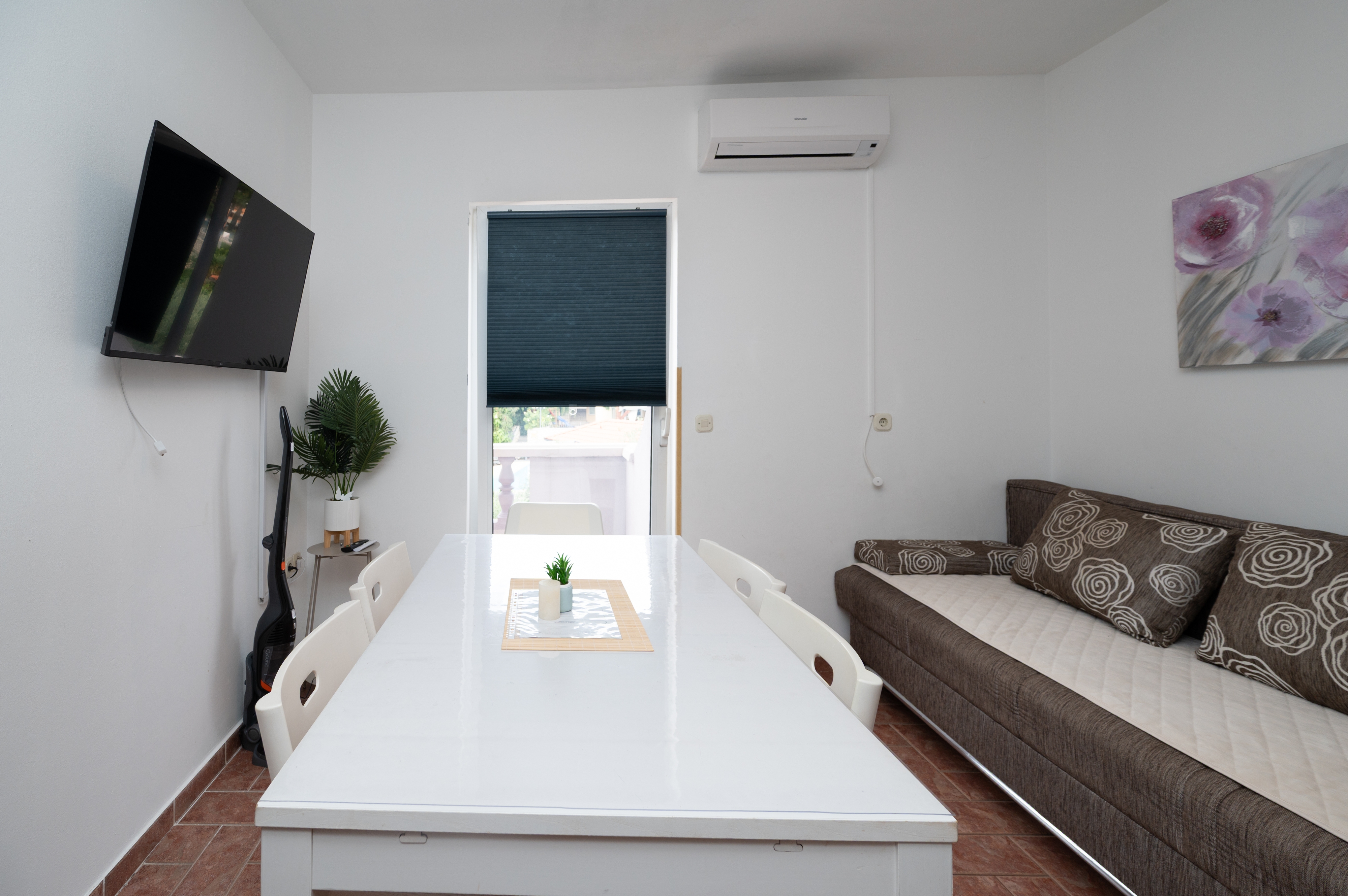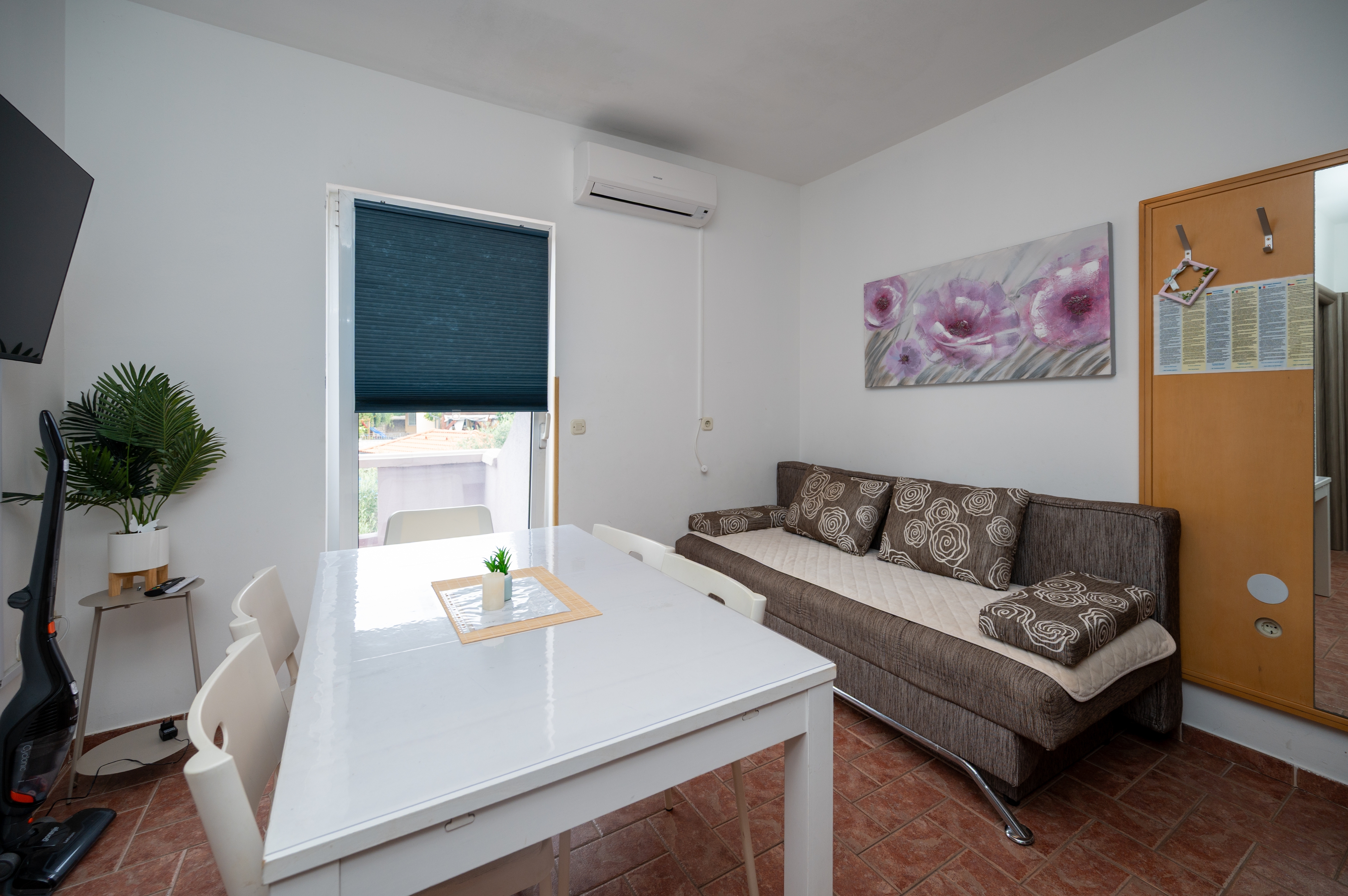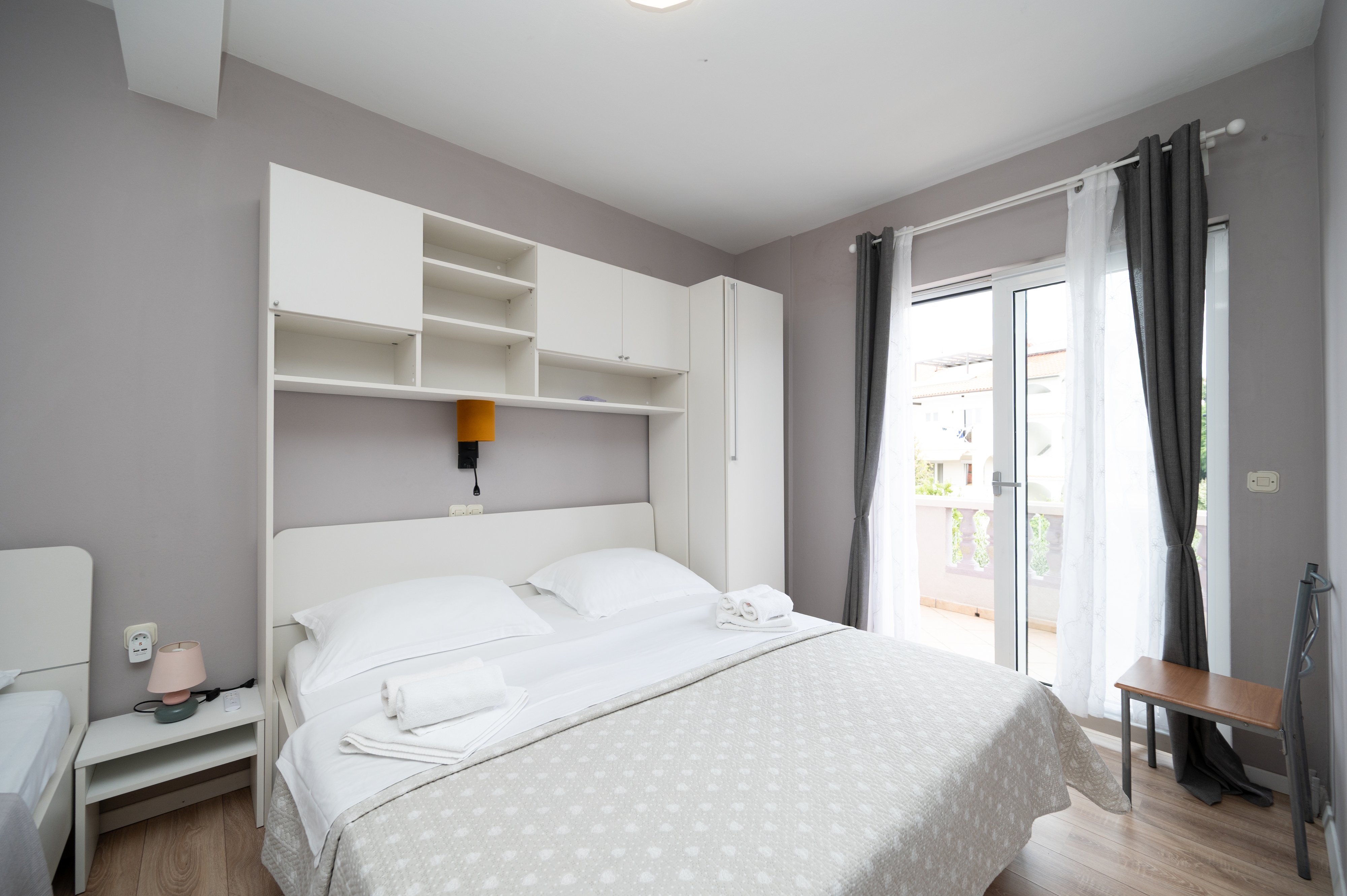 Apartment can accommodate 5 guests. Beds are situated in 2 sleeping rooms, within 45m2. Guests can use a private balcony to enjoy the warm summer evenings. Food can be prepared using barbecue which is shared with other guests too. This accommodation unit welcomes pets at an additional charge. INCLUDED IN THE PRICE: final cleaning, air-conditioning, parking, internet, bicycle, baby cot, iron, ironing board, hairdryer. OBLIGATORY ADDITIONAL COSTS: tourist tax (adults €0.93 - €1.90 nightperson, discount for children aged 12 - 17), short stay fee (surcharge depending on a number of booked nights: 30% - 1, 20% - 2, 10% - 3). OPTIONAL ADDITIONAL COSTS: laundry (€5.00 washing), pets (€15.00 per night). The availability of additional services for your chosen dates of stay, as well as their prices (if none are listed) must be checked ahead of time. Any additional services not shown in the price calculation are payable directly to the property owner and only if used by the visitor. Discounts to the base price: free day 28=25 (for stays of 28 days or more, we give you 3 days free of charge for the stay until 31122026).