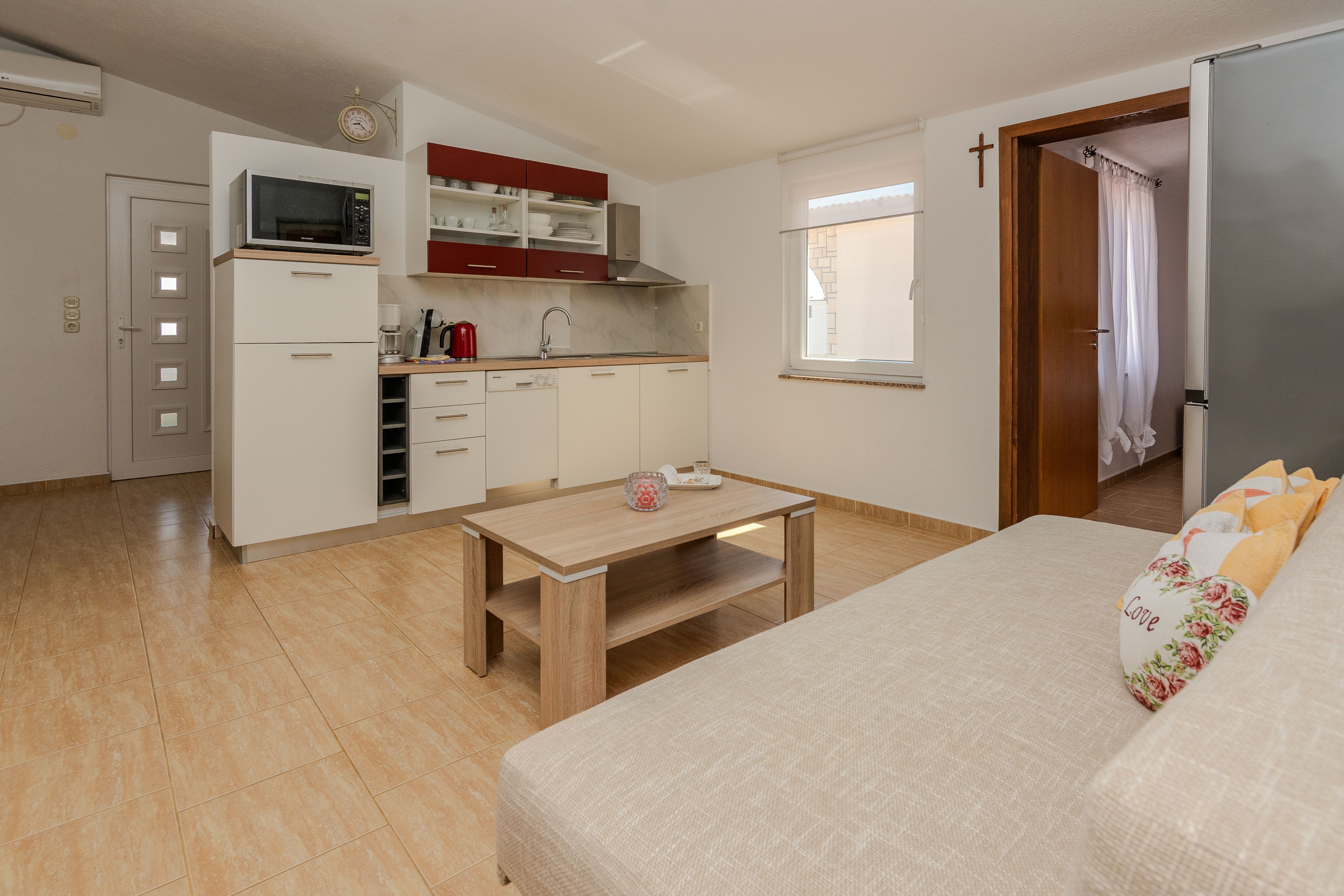 Apartment can accommodate 5 guests. Beds are situated in 2 sleeping rooms, within 73m2. Guests can use a private terrace to enjoy the warm summer evenings. The apartment offers the sea view. Food can be prepared using barbecue which is shared with other guests too. INCLUDED IN THE PRICE: tourist tax, final cleaning, air-conditioning, parking, internet, baby cot, hairdryer. OBLIGATORY ADDITIONAL COSTS: short stay fee (surcharge depending on a number of booked nights: 30% - 1, 20% - 2, 10% - 3). The availability of additional services for your chosen dates of stay, as well as their prices (if none are listed) must be checked ahead of time. Any additional services not shown in the price calculation are payable directly to the property owner and only if used by the visitor.