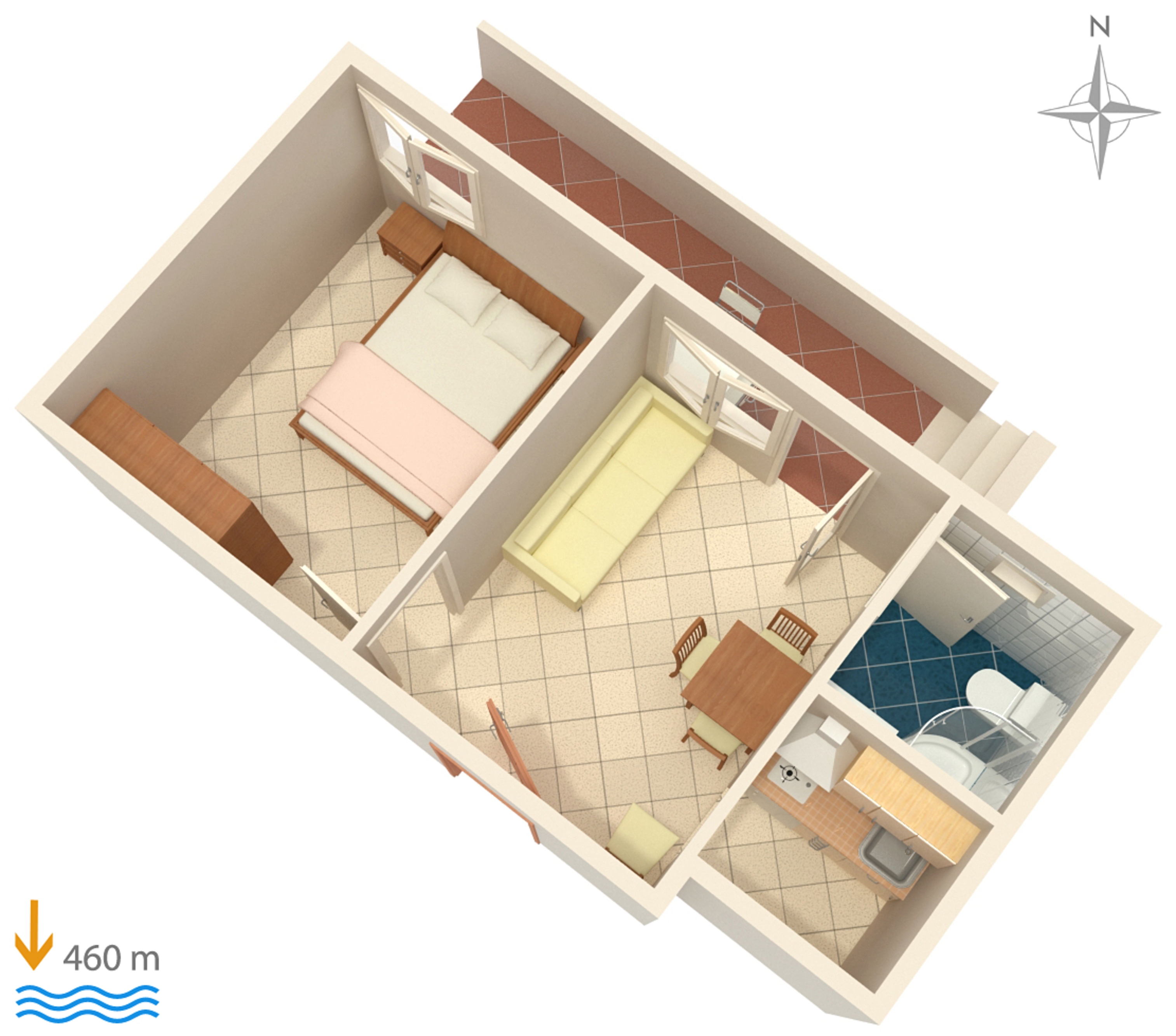Apartment can accommodate 4 guests. Beds are situated in 1 sleeping rooms, but also in the dining room, within 25m2. Guests can use a private terrace to enjoy the warm summer evenings. Food can be prepared using barbecue which is shared with other guests too. INCLUDED IN THE PRICE: tourist tax, final cleaning, air-conditioning, parking, internet, baby cot, portable barbecue. OBLIGATORY ADDITIONAL COSTS: short stay fee (surcharge depending on a number of booked nights: 30% - 1, 20% - 2, 10% - 3). The availability of additional services for your chosen dates of stay, as well as their prices (if none are listed) must be checked ahead of time. Any additional services not shown in the price calculation are payable directly to the property owner and only if used by the visitor.