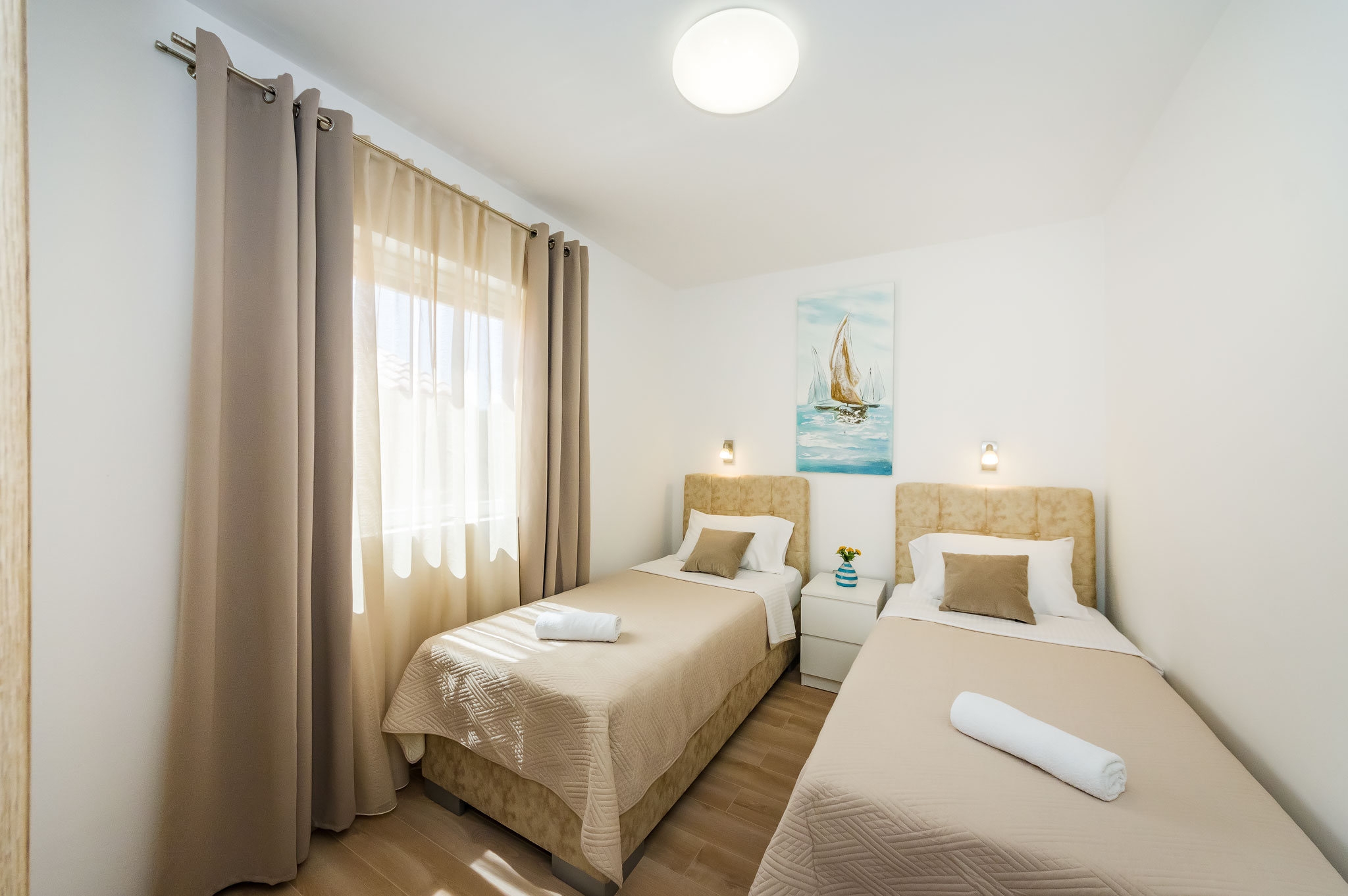 Apartment can accommodate 6 guests. Beds are situated in 2 sleeping rooms, but also in the living room, within 41m2. Guests can use a private terrace to enjoy the warm summer evenings. Food can be prepared using barbecue which is shared with other guests too. INCLUDED IN THE PRICE: tourist tax, final cleaning, air-conditioning, parking, internet, baby cot. OBLIGATORY ADDITIONAL COSTS: short stay fee (surcharge depending on a number of booked nights: 30% - 1, 20% - 2, 10% - 3). OPTIONAL ADDITIONAL COSTS: laundry (€3.00 washing). The availability of additional services for your chosen dates of stay, as well as their prices (if none are listed) must be checked ahead of time. Any additional services not shown in the price calculation are payable directly to the property owner and only if used by the visitor.