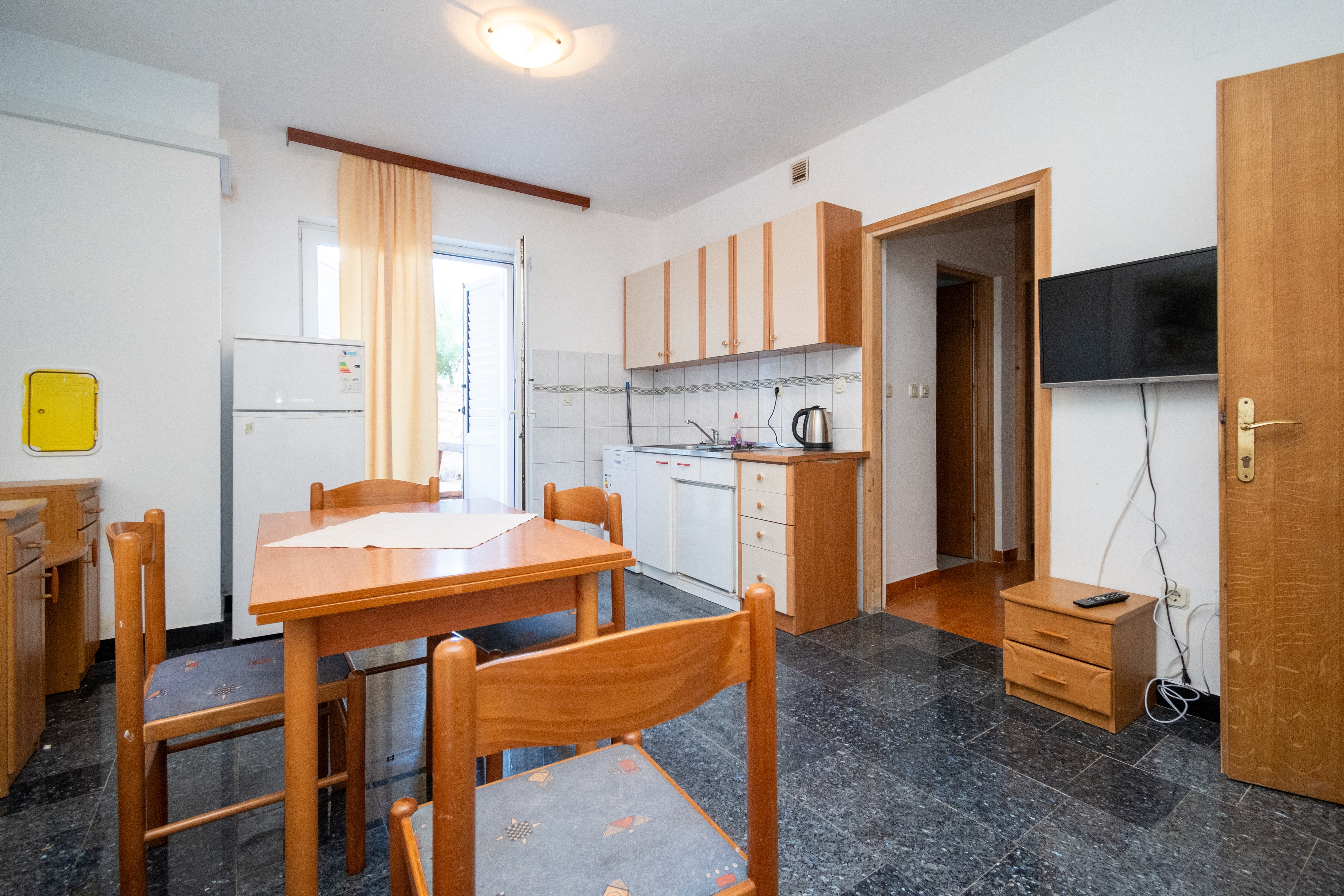 Apartment can accommodate 6 guests. Beds are situated in 2 sleeping rooms, but also in the living room, within 44m2. Guests can use a private terrace to enjoy the warm summer evenings. Food can be prepared using barbecue which is shared with other guests too. This accommodation unit welcomes pets at an additional charge. Notthe rooms of the booked accommodation unit are connectedone whole. Some of the rooms of the accommodation unit are not connected with the rest of the unit. INCLUDED IN THE PRICE: tourist tax, final cleaning, parking, internet. OBLIGATORY ADDITIONAL COSTS: short stay fee (surcharge depending on a number of booked nights: 30% - 1, 20% - 2, 10% - 3). OPTIONAL ADDITIONAL COSTS: air-conditioning (€5.00 per night), pets (€10.00 per night), additional bed (€10.00 per night). The availability of additional services for your chosen dates of stay, as well as their prices (if none are listed) must be checked ahead of time. Any additional services not shown in the price calculation are payable directly to the property owner and only if used by the visitor. Discounts to the base price: free day 14=13 (for reservations of 14 or more days you get one free day for the stay until 31122026).